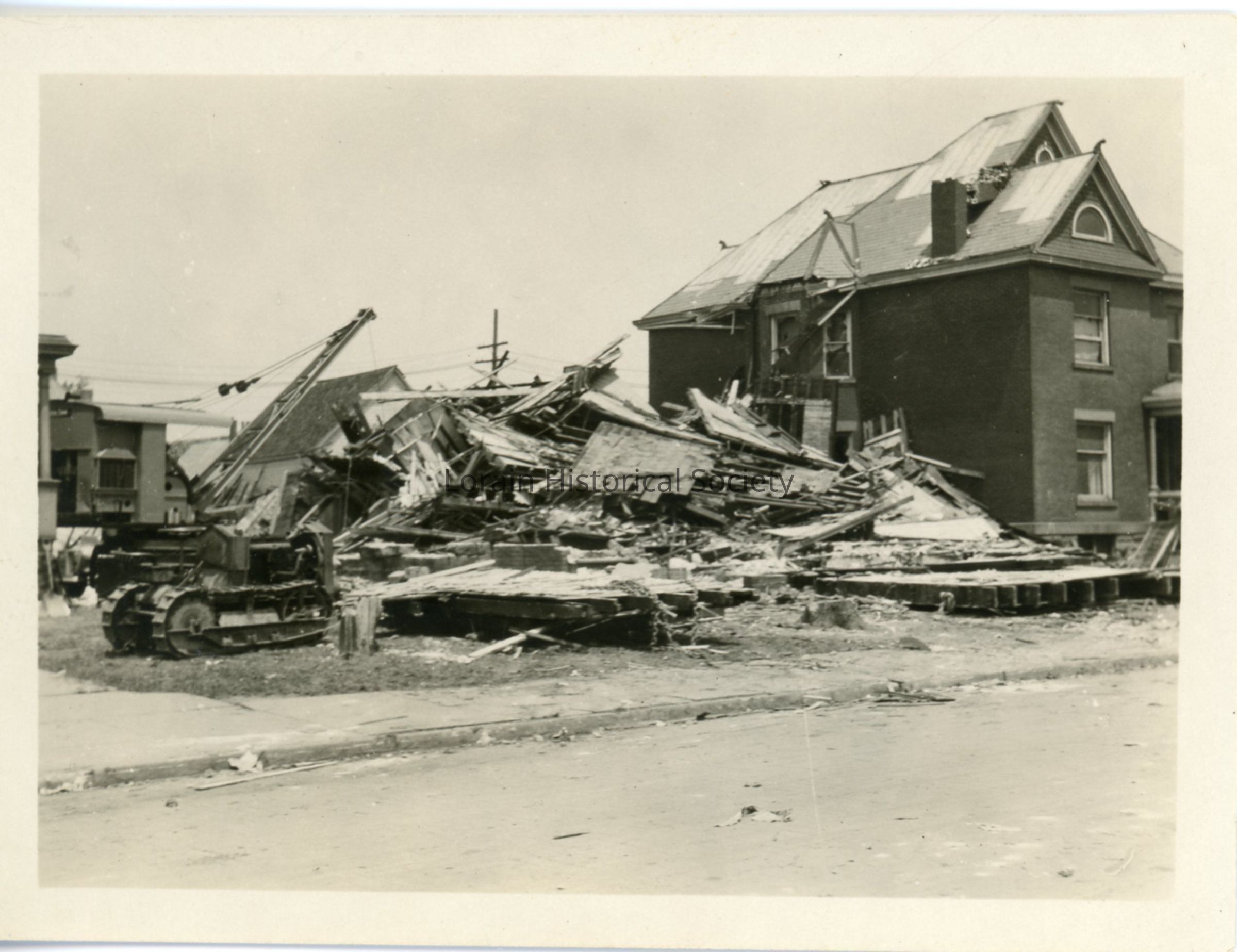 Photograph is black and white view of unidentified houses showing destruction, damage and debris from 1924 Tornado. Equipment in left foreground is being used to clear away debris from completely destroyed house.Acquisition