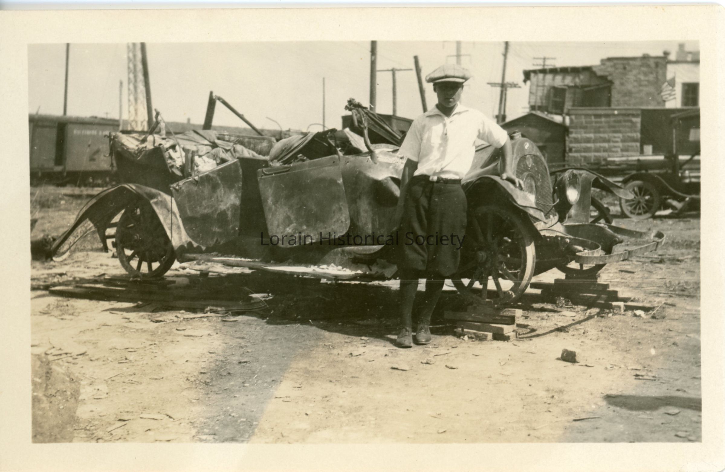 Photograph is black and white view of unidentified man standing in front of automobile destroyed in 1924 Tornado. Unidentified house in background showing damage and destruction from tornado.Acquisition
