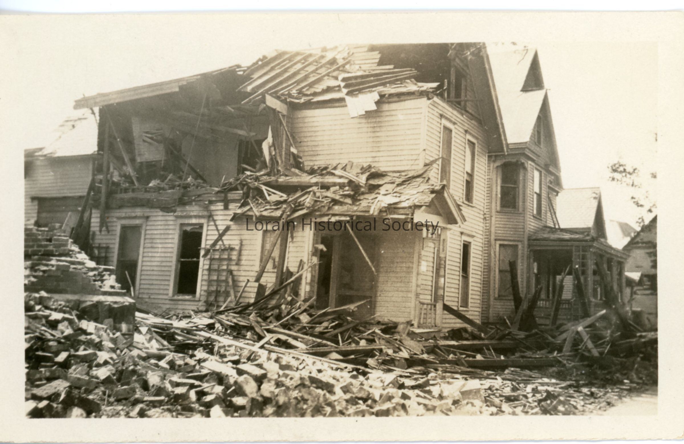 Photograph is black and white view of unidentified house showing damage, destruction and debris from 1924 Tornado.Acquisition