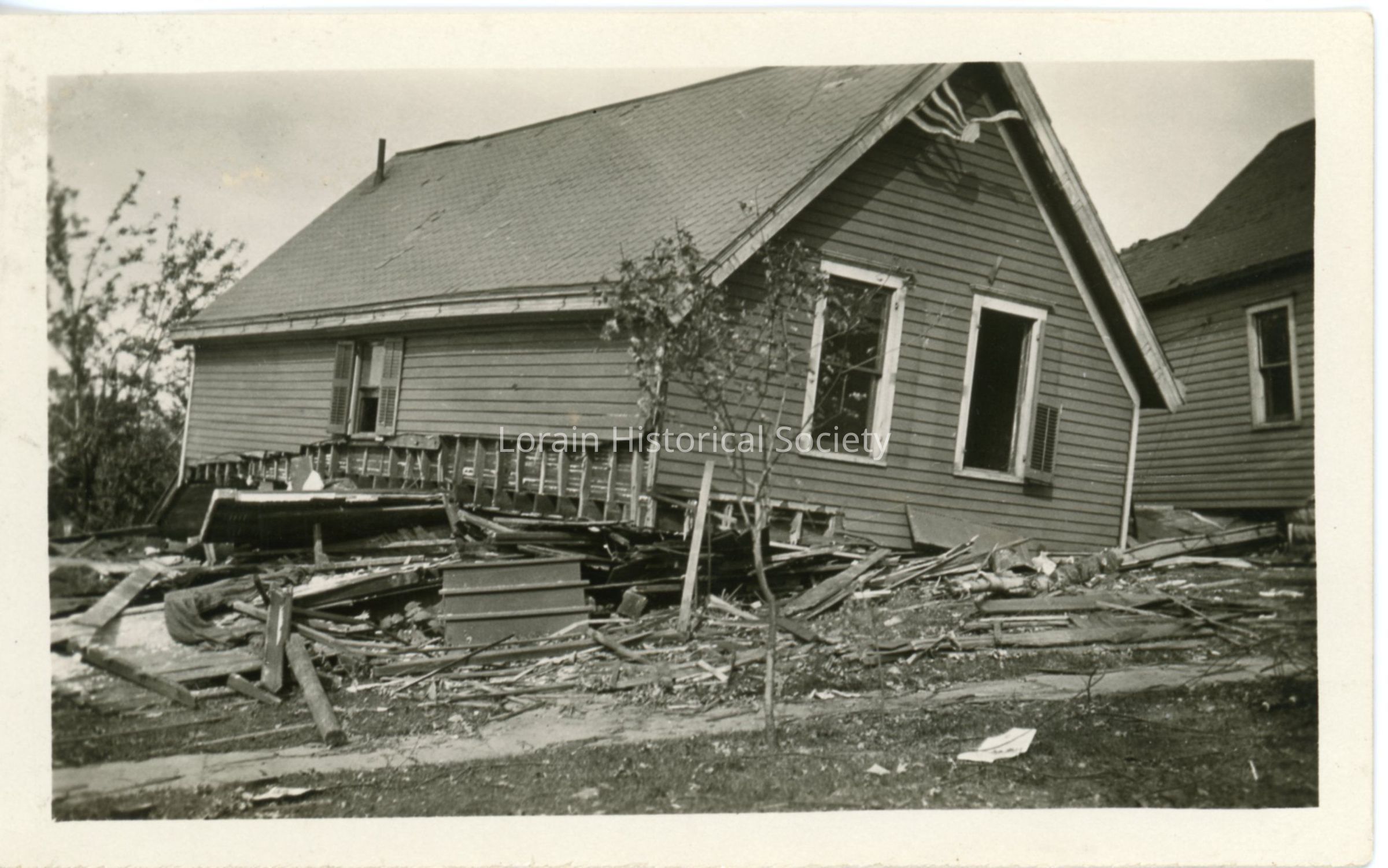Photograph is black and white view of unidentified house showing damage, destruction and debris from 1924