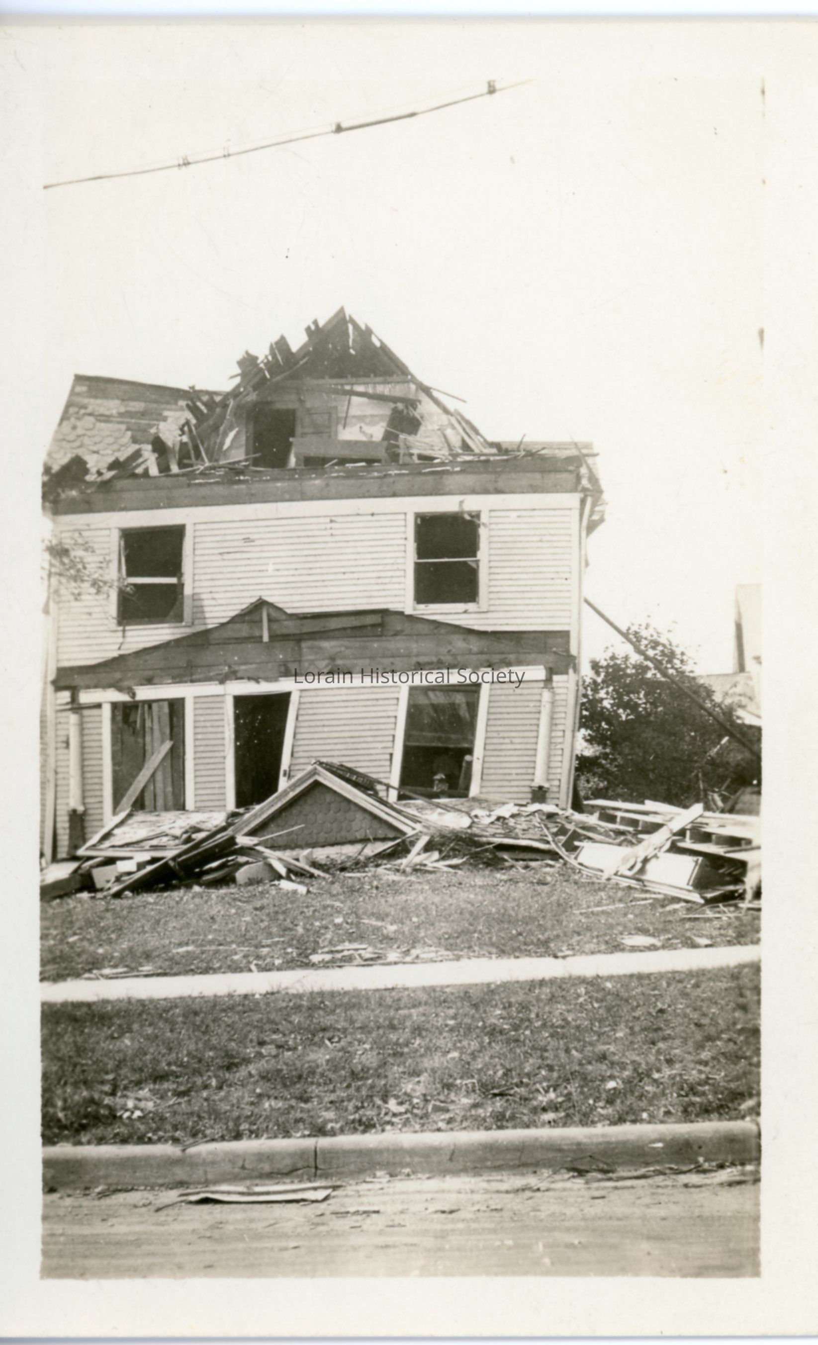 Photograph is black and white view of unidentified house showing damage, destruction and debris from 1924 Tornado. (Might be 1123 West Sixth Street, Albert and Arthur Helfrich Home).Acquisition