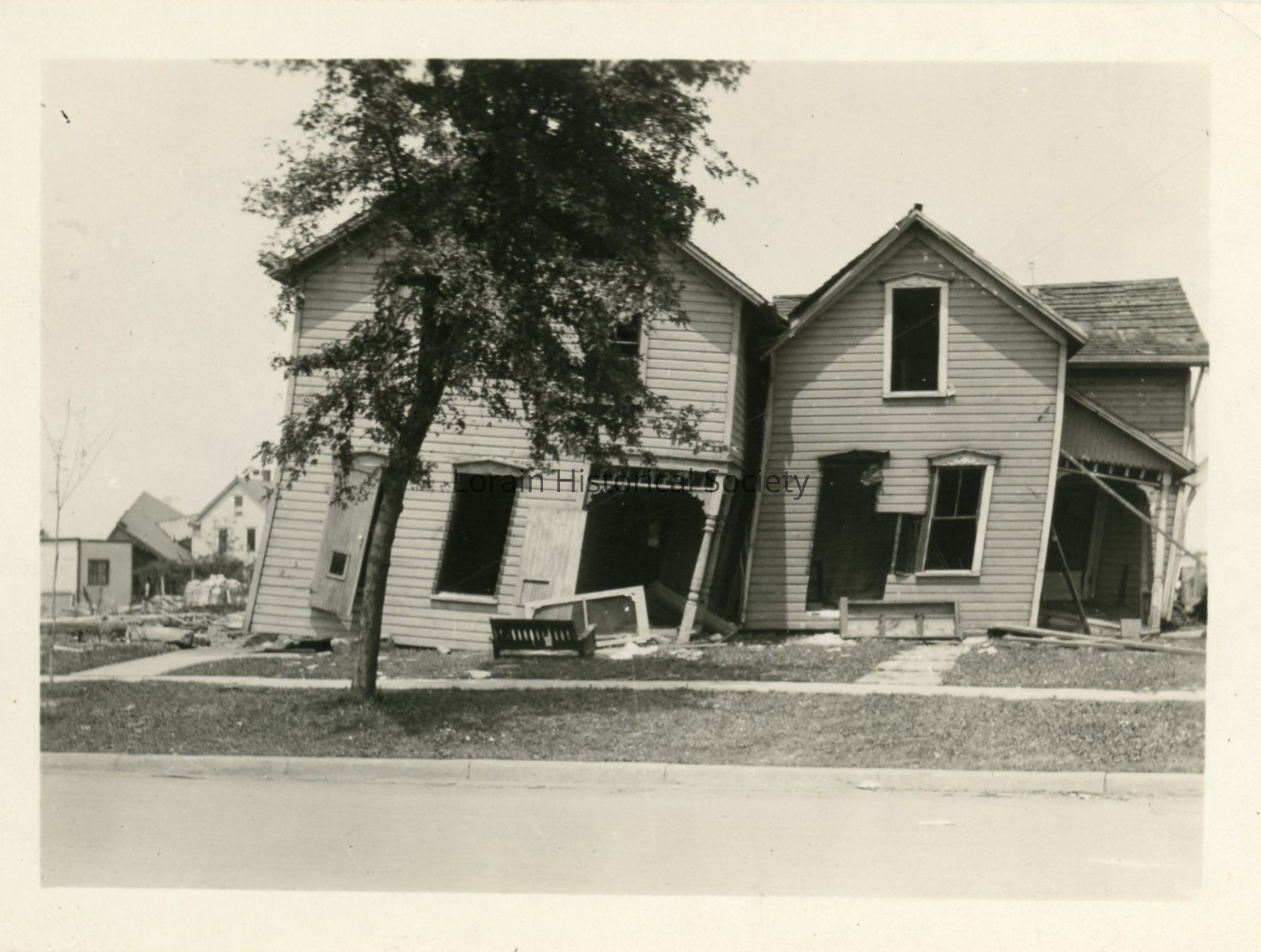 Photograph is black and white view of unidentified houses showing damage and destruction from 1924 Tornado. House on the left is lifted from its foundation and pushed into house on the right. Unidentified houses in left background.Acquisition