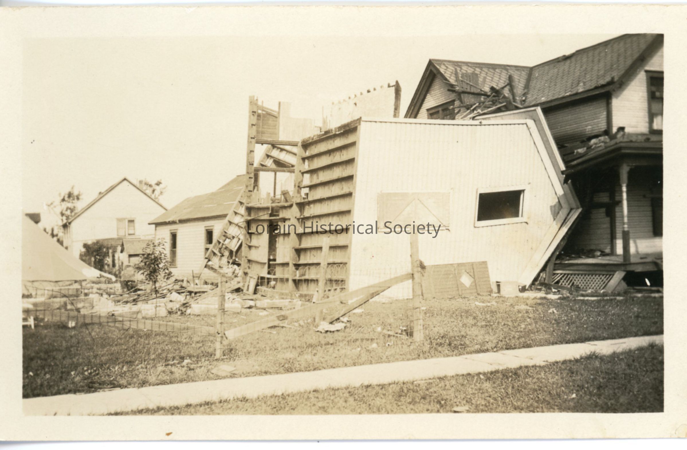 Photograph is black and white view of unidentified houses showing destruction, damage and debris from 1924 Tornado. One house is turned over on its side. Tent is in left foreground.Acquisition
