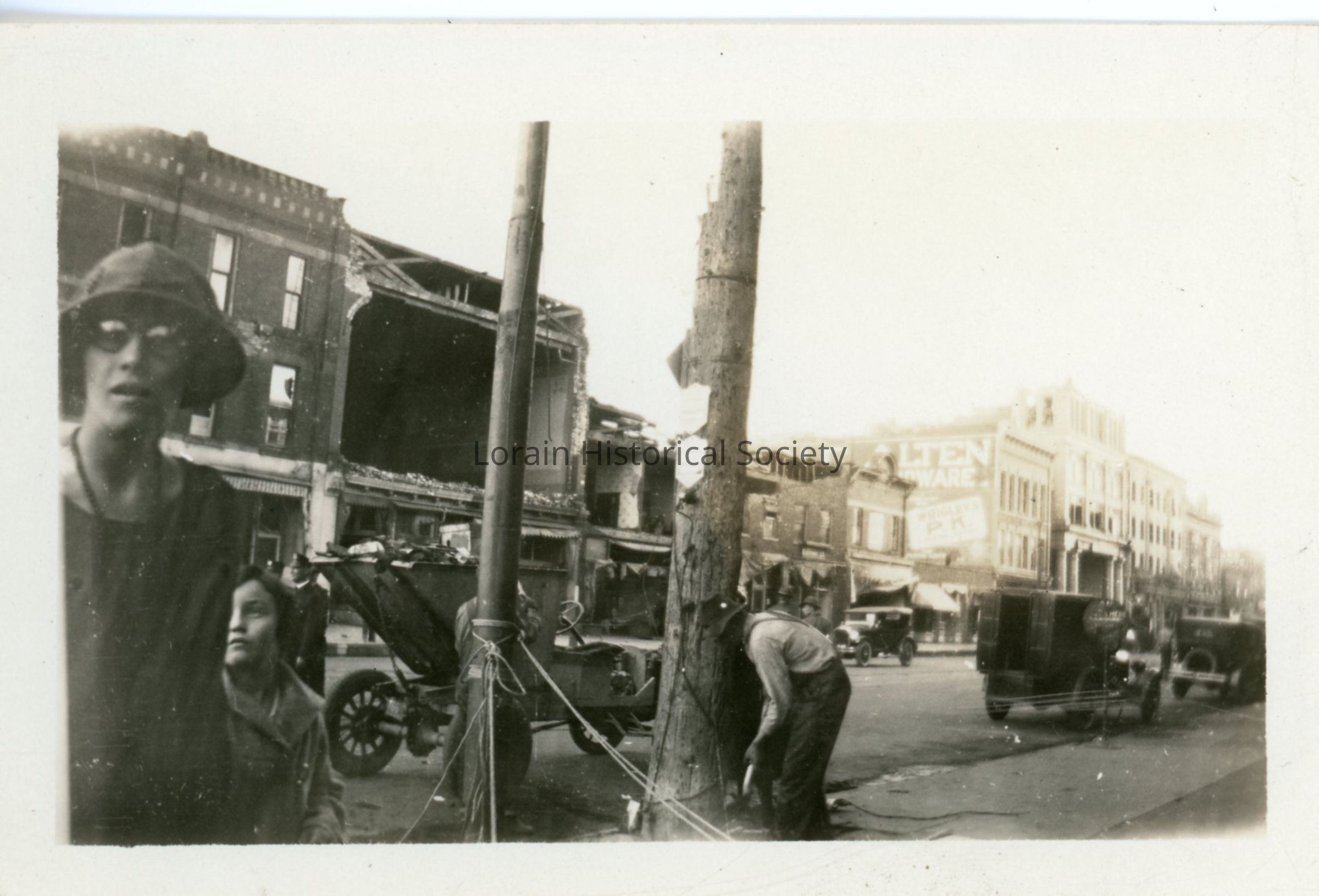 Photograph is black and white view of Broadway looking south toward the State Theatre showing damage and destruction from 1924 Tornado. Unidentified woman, child and workman in foreground and automobiles parked on street. L to R: 345 Broadway, Universal Bearing Co., Lorain Brass and Bronze Foundry; 347-349 Broadway, Vacant; 351 Broadway, Harry C. Stacey Restaurant; 353-359 Broadway, Alten Hardware; 361-371 Broadway, Wickens Building; 375 Broadway, State Theatre.Photograph Details