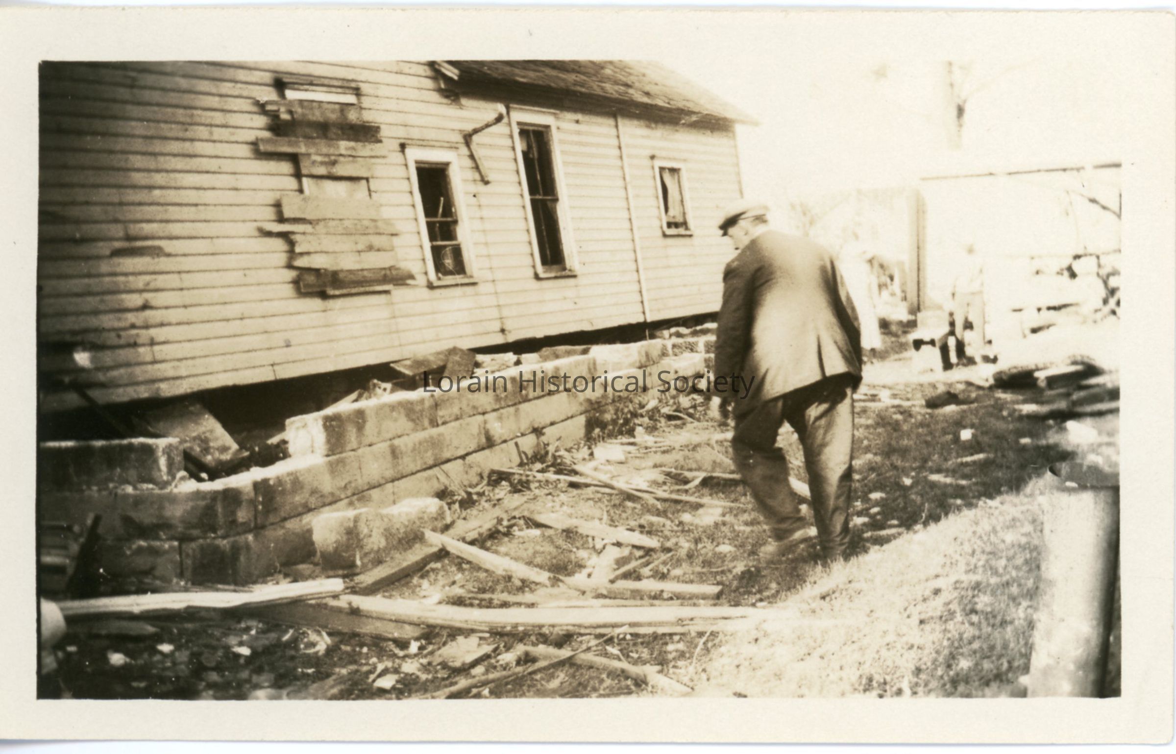 Photograph is black and white view of unidentified house showing damage, destruction and debris from 1924 Tornado. Unidentified man is standing on the side of house looking at the damage.Acquisition