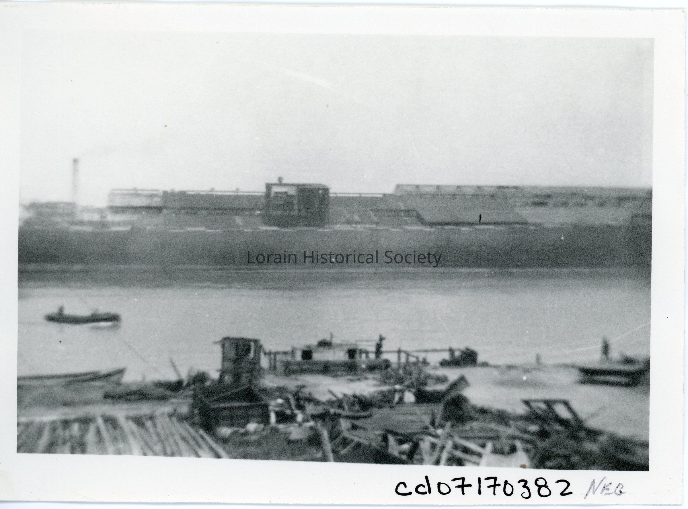 Photograph is black and white view of the Shipyards showing damage from 1924 Tornado.