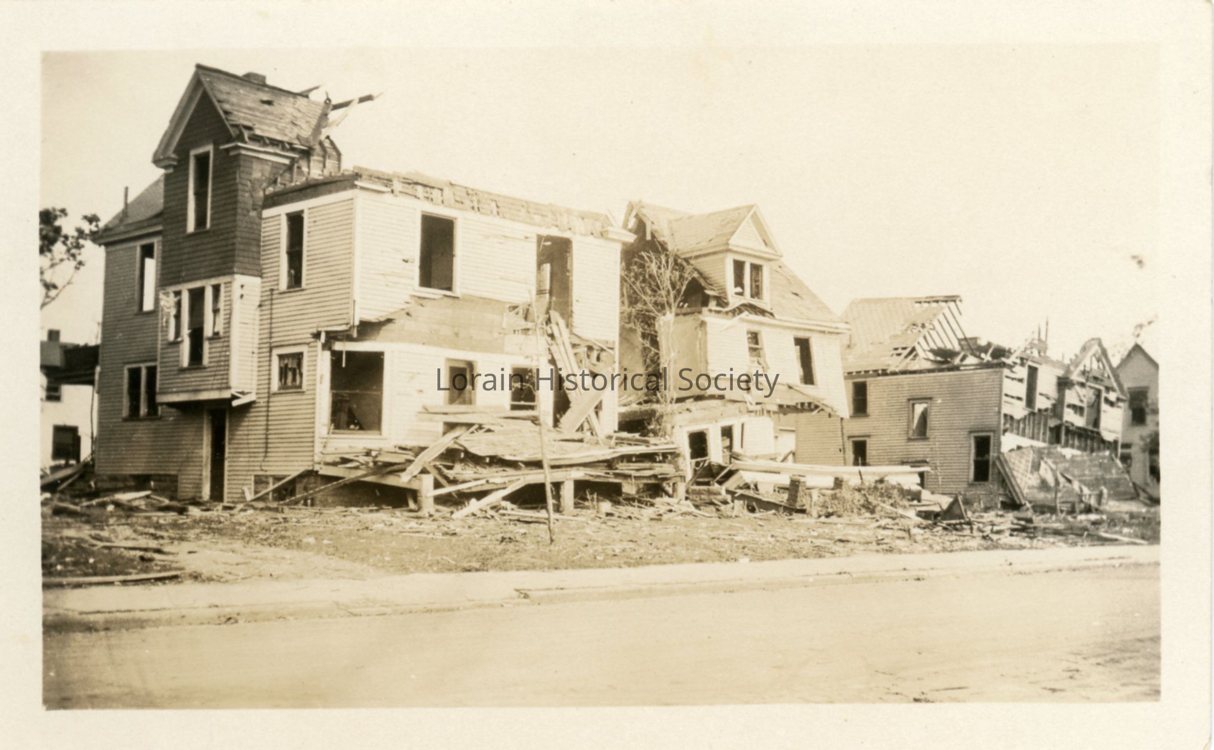 Photograph is black and white view of houses on Hamilton Avenue showing destruction, damage and debris from 1924 Tornado. L to R: 517 Hamilton Avenue, Lynola and Edward B. Lyons Home; 526 Hamilton Avenue, Lottie L. and Hallie R. Ward Home; 534 Hamilton Avenue, Agnes L. and William J. Coulter Home.Photograph Details
