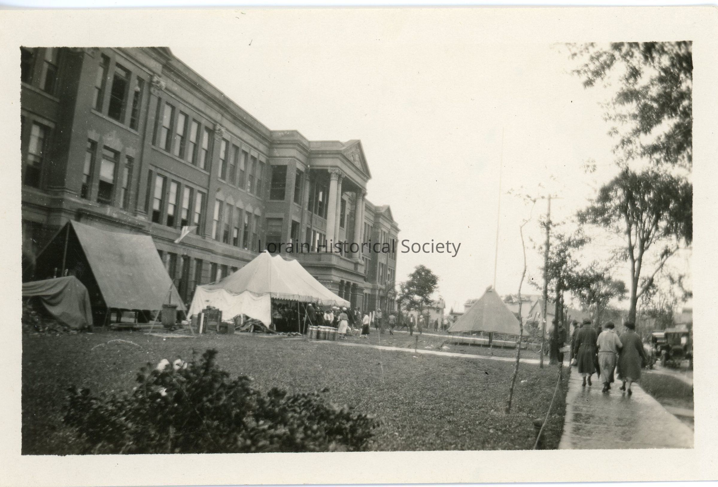 Photograph is black and white view of Lorain High School, 553 Washington Avenue, with tents set up in front. The high school was used as a temporary morgue and Red Cross headquarters after the 1924 Tornado.Photograph Details