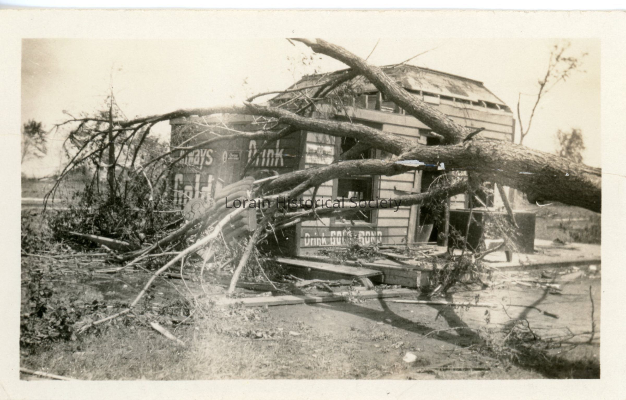 Photograph is black and white view of unidentified building showing damage and landscape debris from 1924 Tornado.Acquisition