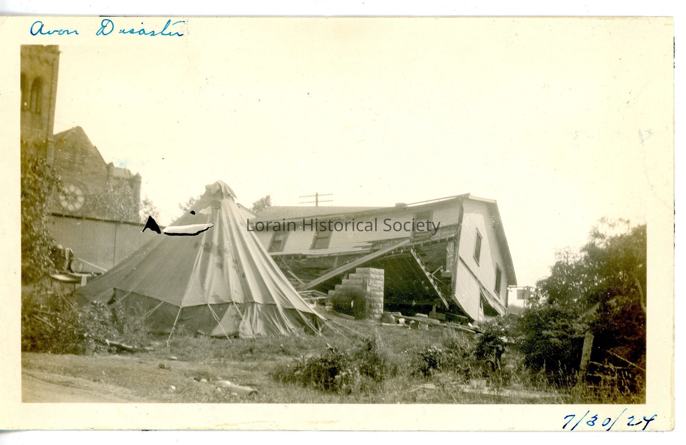 Photograph is black and white view of house in Avon, Ohio damaged in 1924 Tornado with tent in front yard and church in left background 7/30/1924.Acquisition