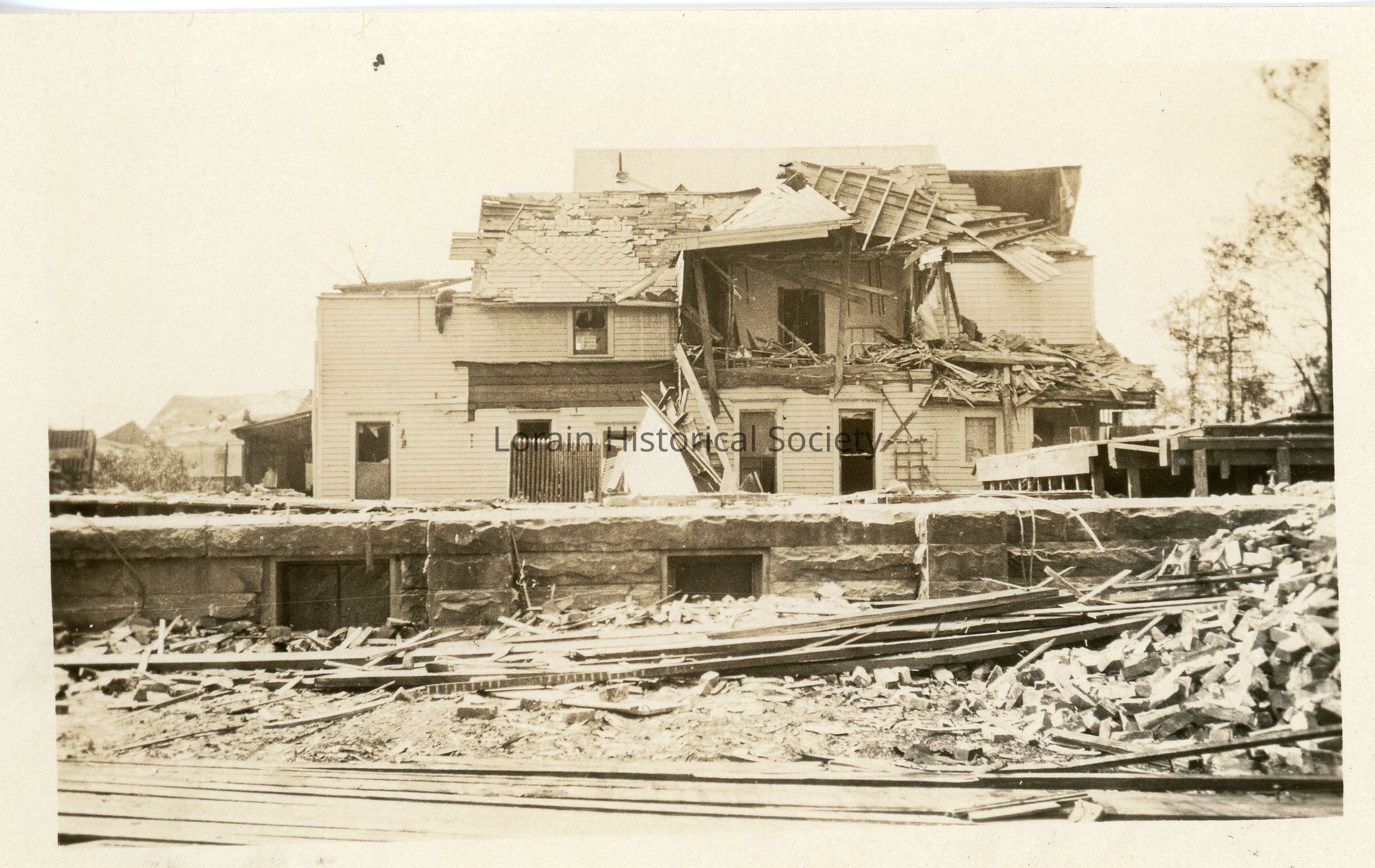 Photograph is black and white view of unidentified house showing damage, destruction and debris from 1924 Tornado.Acquisition