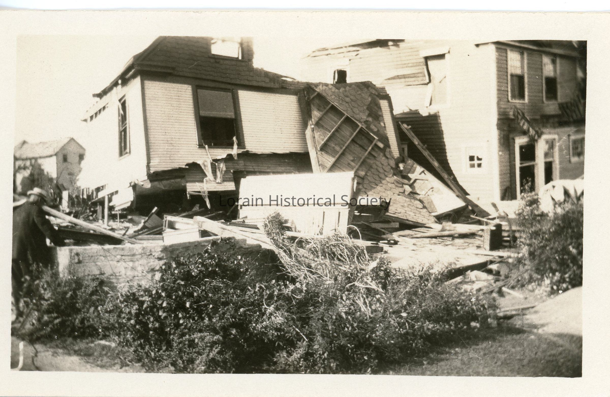 Photograph is black and white view of houses on West Fifth Street showing destruction, damage and debris from 1924 Tornado. L to R: 1134 West Fifth Street, Herman E. Hageman Home (completely destroyed); 1128 West Fifth Street, Clarence E. VanDeusen Home; 1124 West Fifth Street, Florence and Michael Scanlan Home.Photograph Details