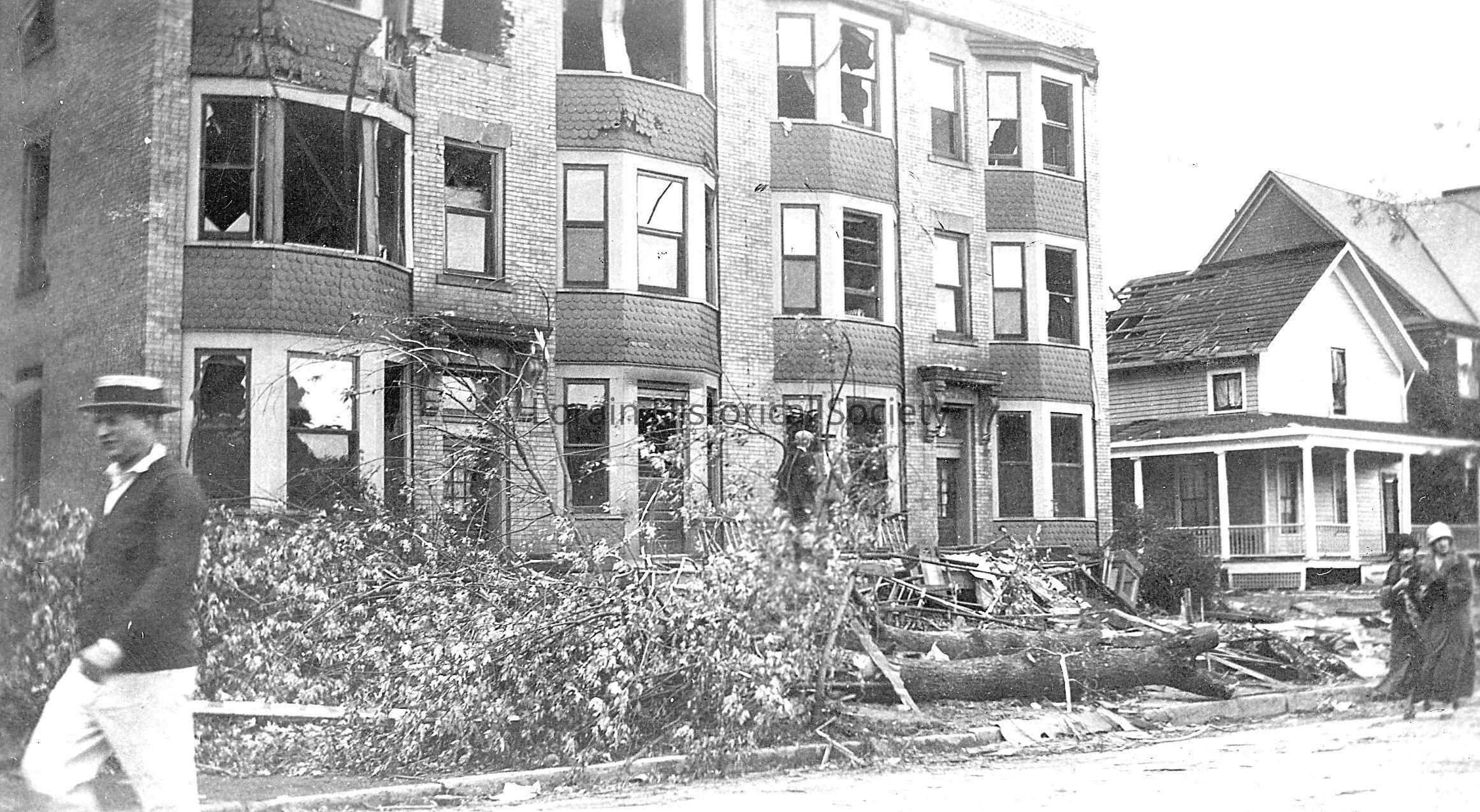 Photograph is black and white view of The Colonial Hotel, 303-309 West Fourth Street, showing damage and debris from 1924 Tornado.Photograph Details