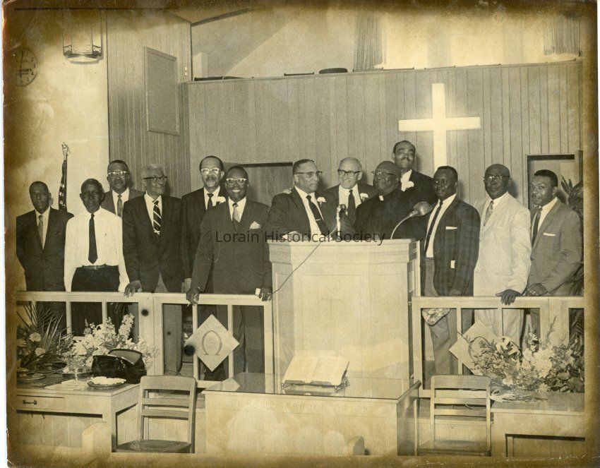 Second Baptist Church. Man is speaking at the podium and men are standing up with him on the altar. Photo by Robert J. Smith, dated July 26, 1969. On the far right is Leroy Jackson. Standing next to Mr Jackson is Russell Allen.Collection