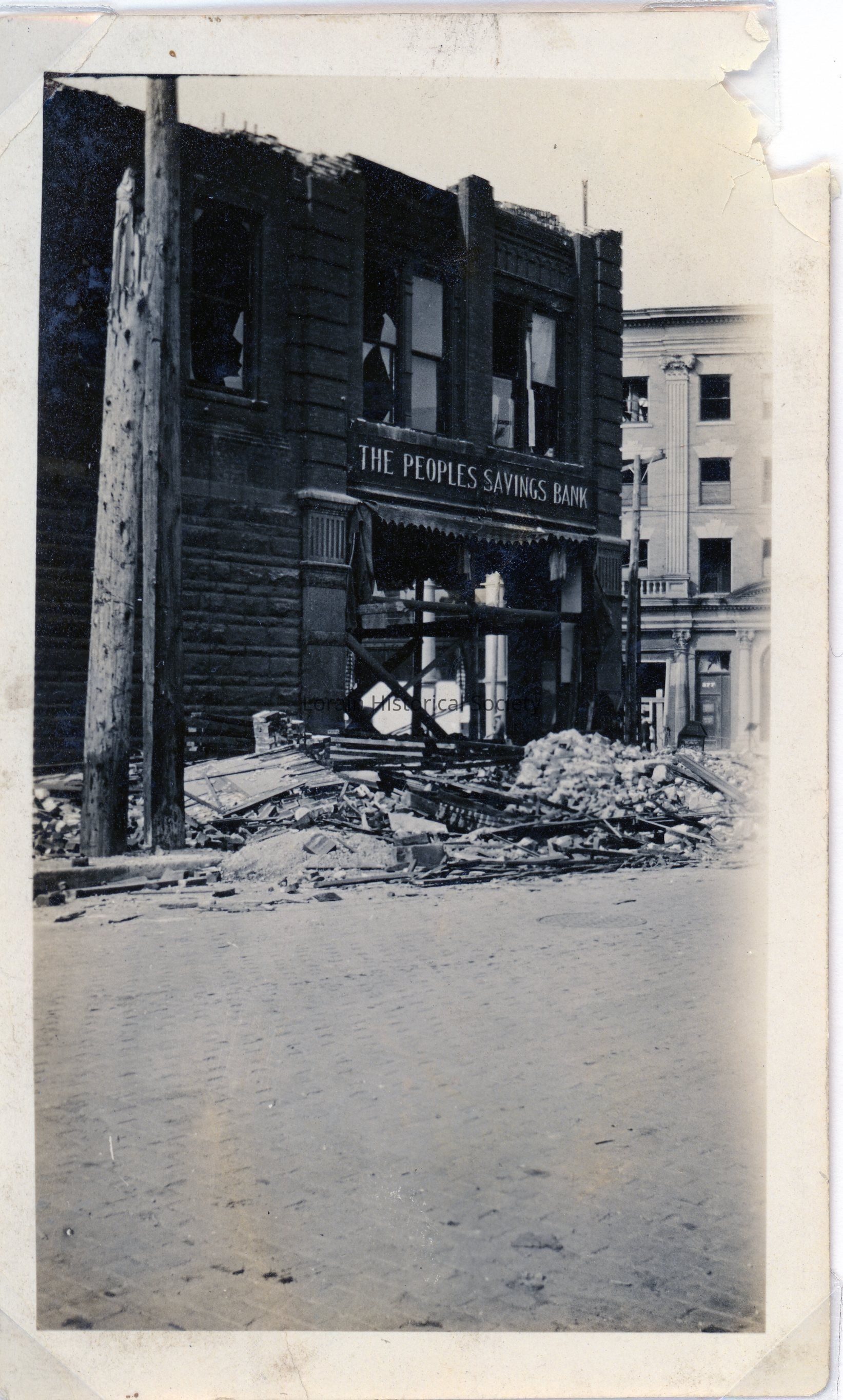 Photograph is black and white view of The Peoples Savings Bank, 374 Broadway, showing damage, destruction and debris from 1924 Tornado.