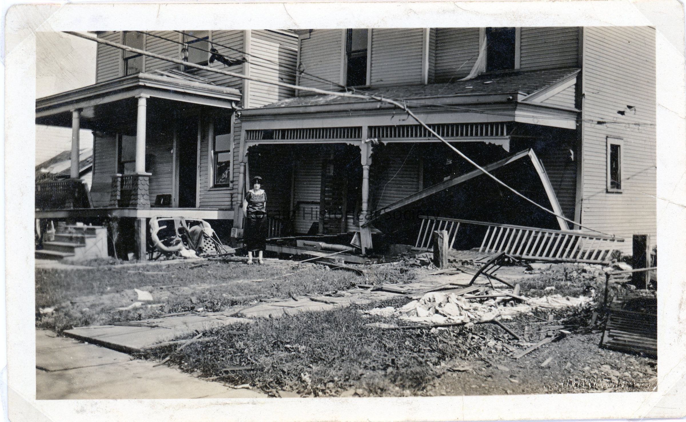 Photograph is black and white view of unidentified houses showing damage, destruction, and debris from 1924 Tornado. Unidentified woman standing in front of house on right.Acquisition
