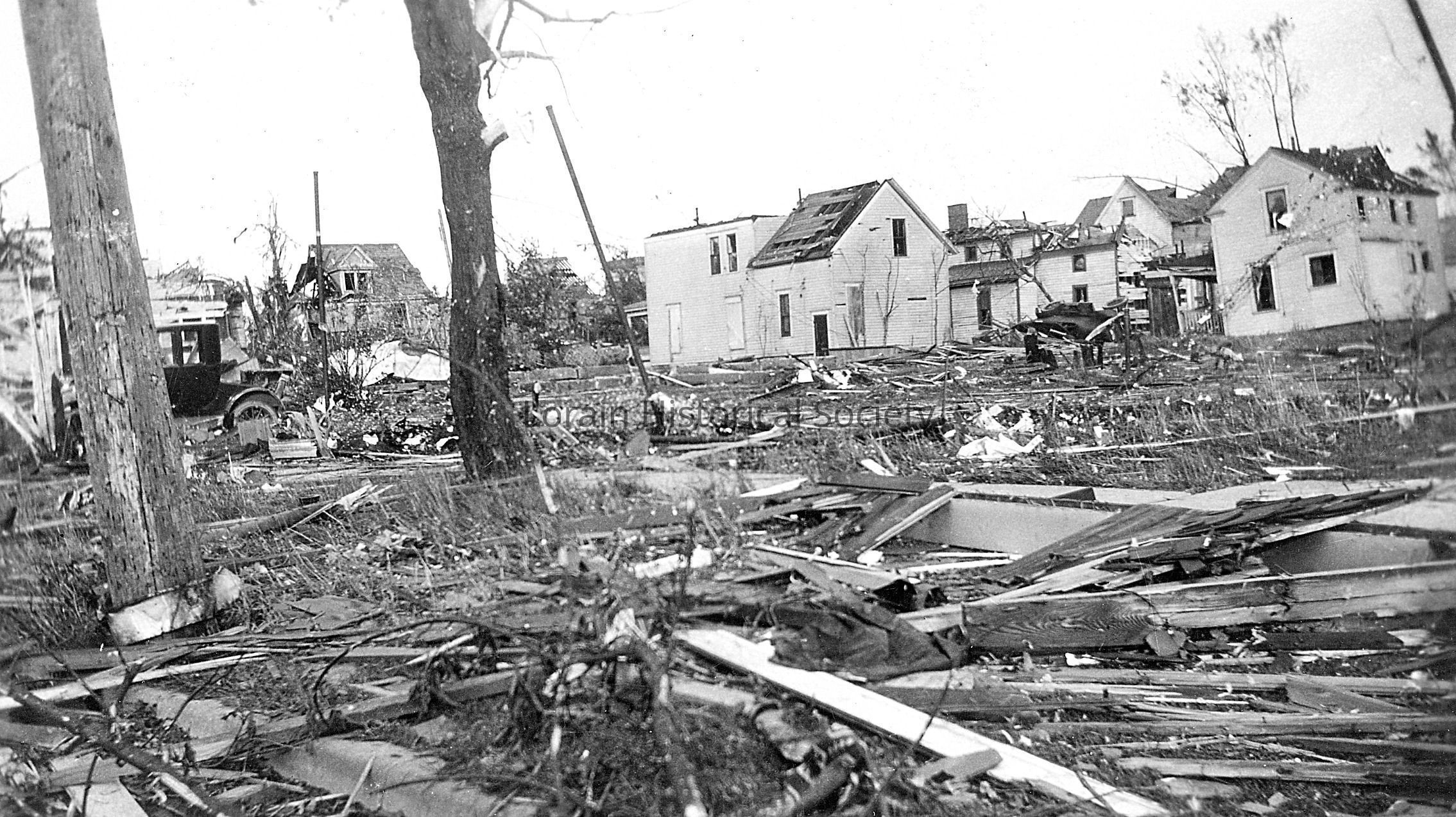 Photograph is black and white view of houses on Hamilton Avenue looking east toward West Fifth Street showing damage, destruction and debris from 1924 Tornado.
