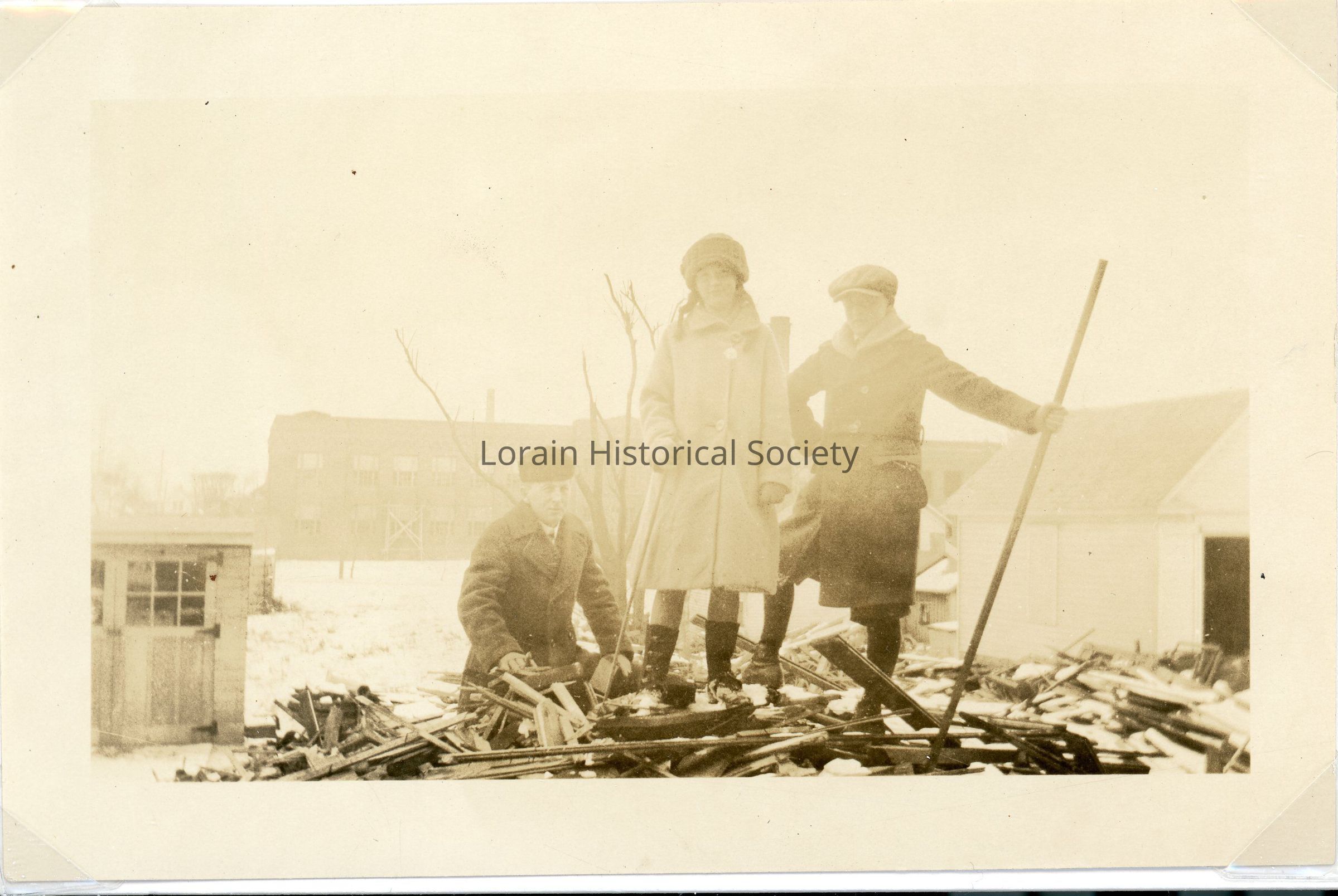Photograph is black and white view of Clarence E., Jean and Richard Van Deusen (L to R) cleaning up after 1924 Tornado.Acquisition