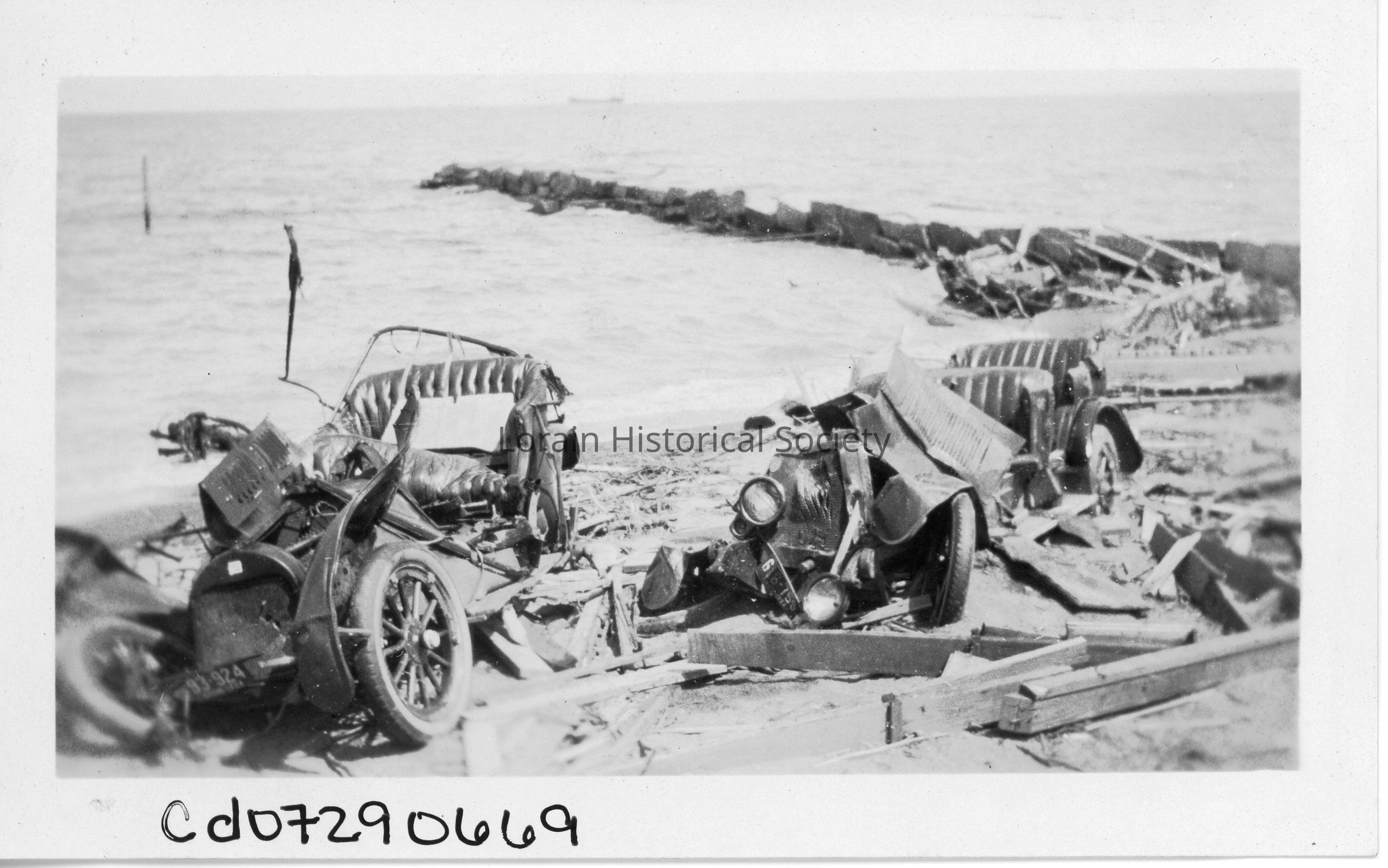Photograph is black and white view of autos on Lakeview Beach destroyed by 1924 Tornado.Acquisition