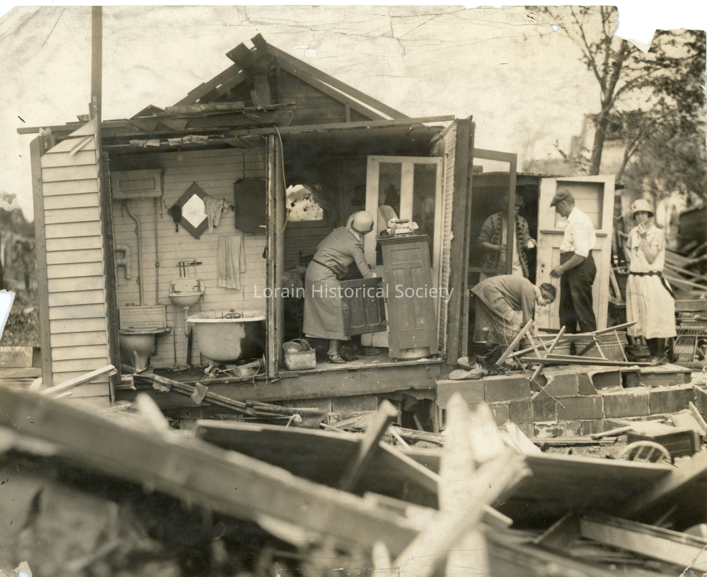 Photograph is black and white view of 618 Brownell Avenue, Mary E. and William S. Conners Home, showing damage from 1924 Tornado and individuals moving items and furniture out of house. The exposed bathroom and bedroom from the second floor are now on ground level. "On Brownell Street" written on back of photograph.Acquisition