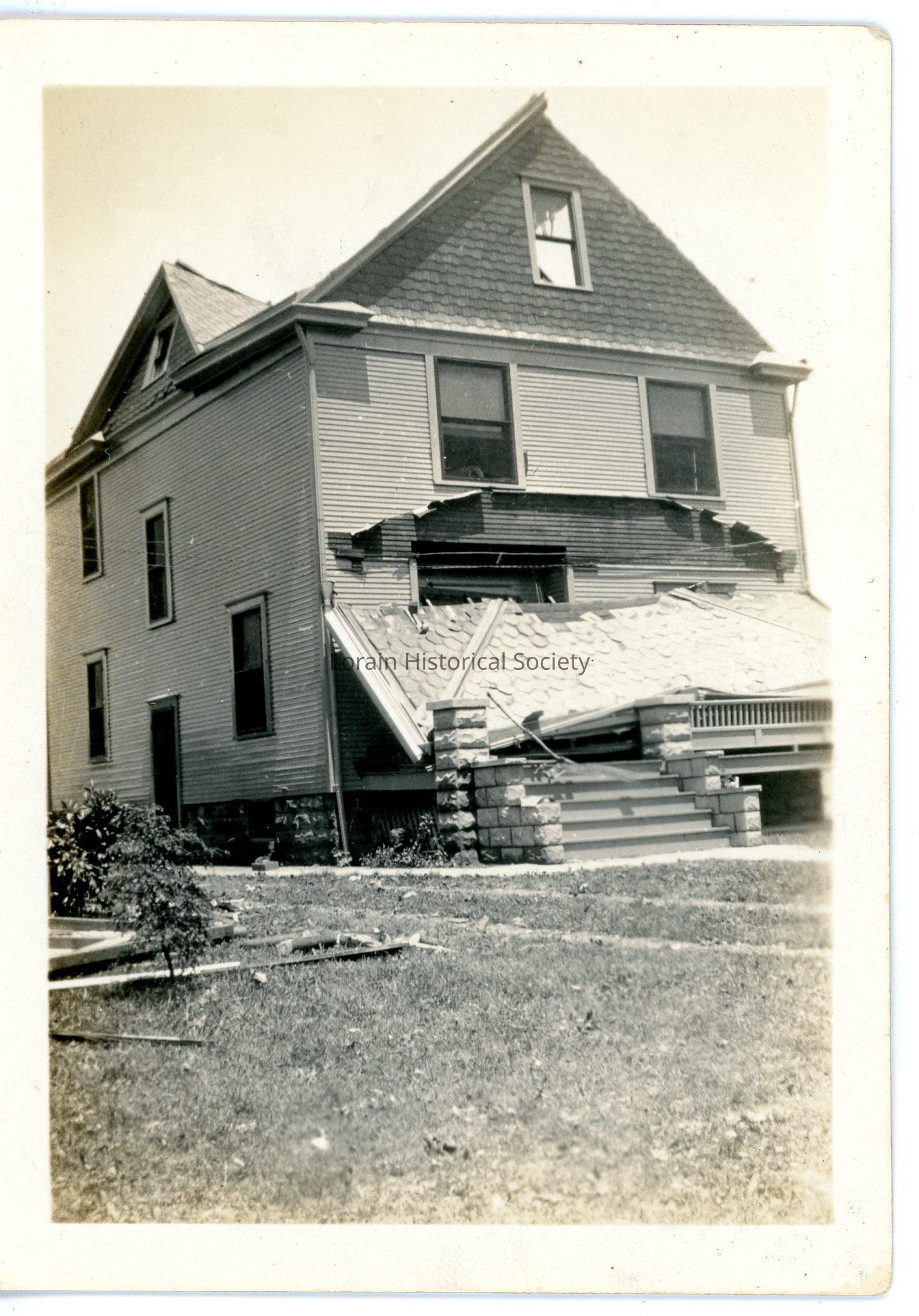 Photograph is black and white view of 205 Washington Avenue, Rose and George Friend Home; Front porch fell down during 1924 Tornado.Acquisition