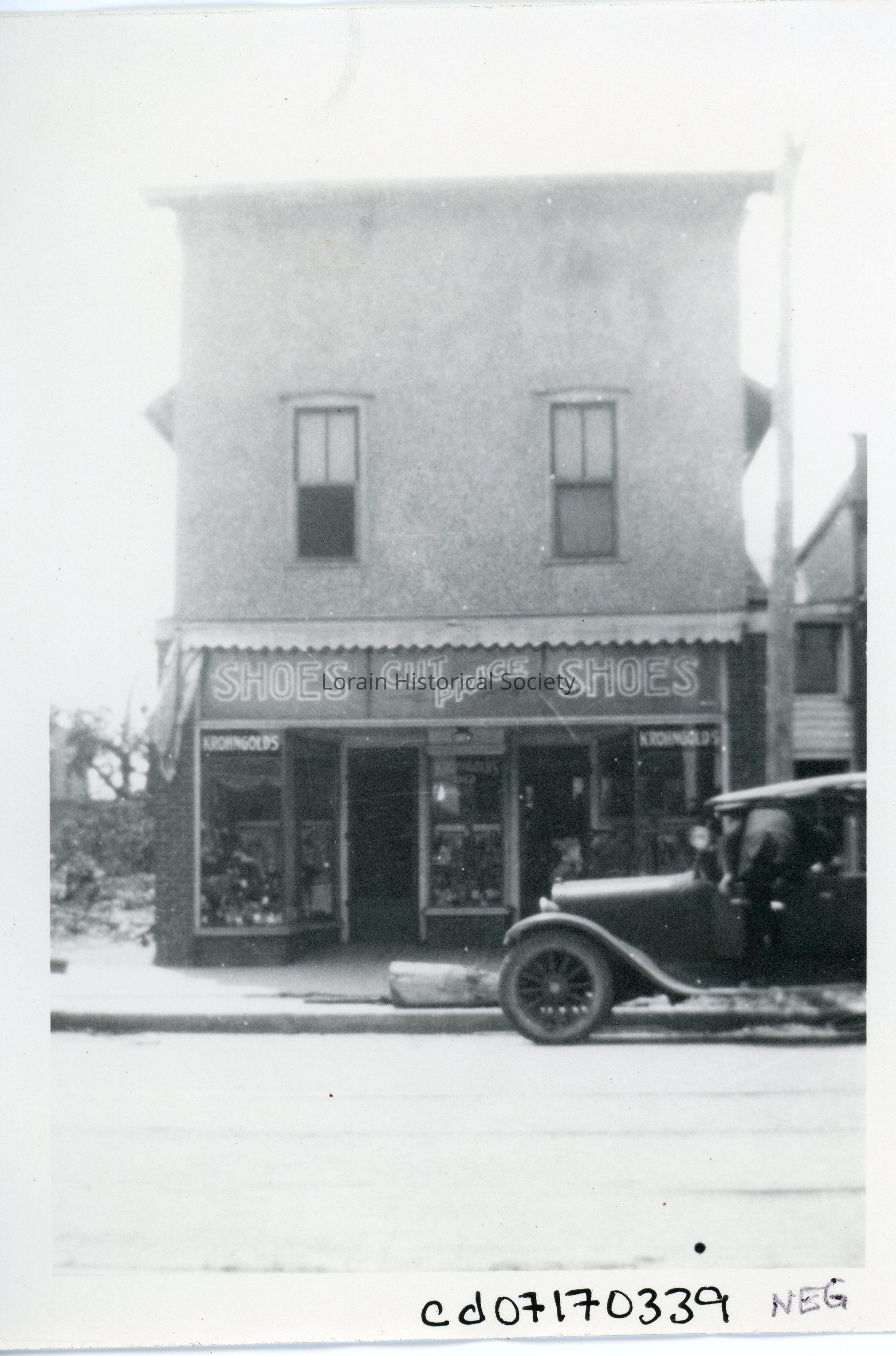 Photograph is black and white view of Krohngold's Shoes, 918 Broadway, after 1924 Tornado.Acquisition