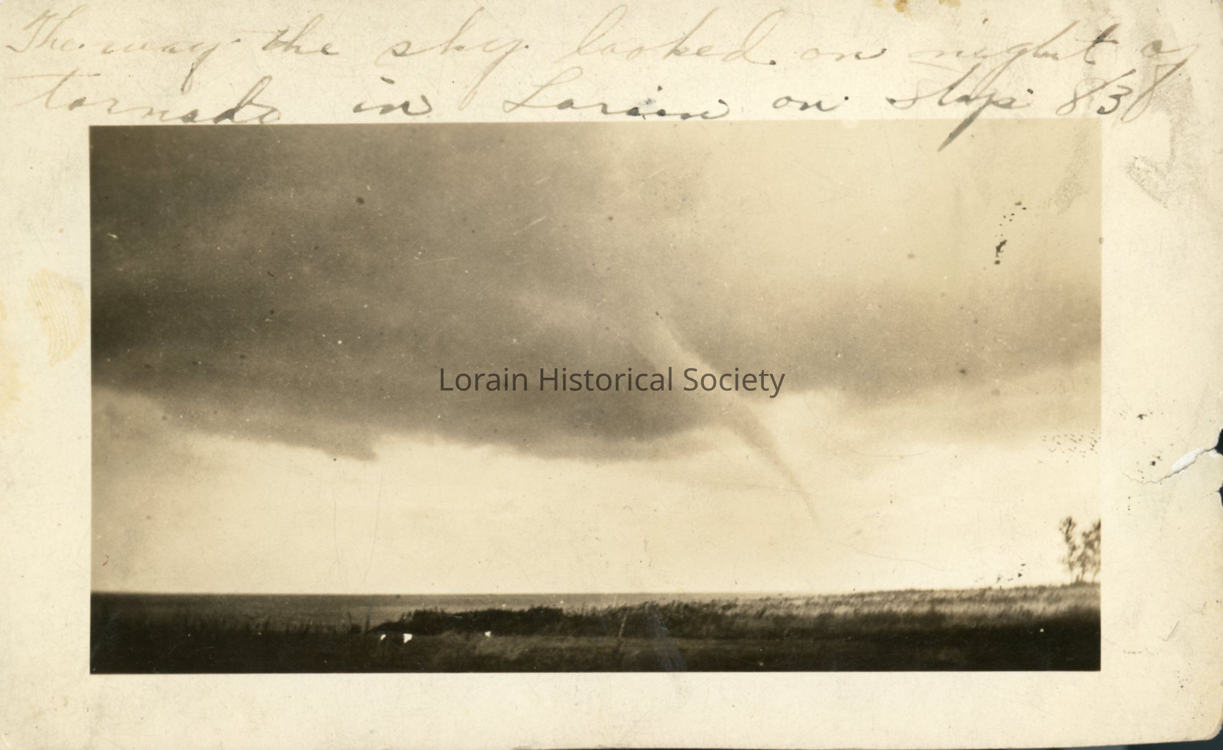 Photograph is view of tornado over Lake Erie. Written on photo: "The way the sky looked on the night of the tornado in Lorain on Stop 83."Acquisition