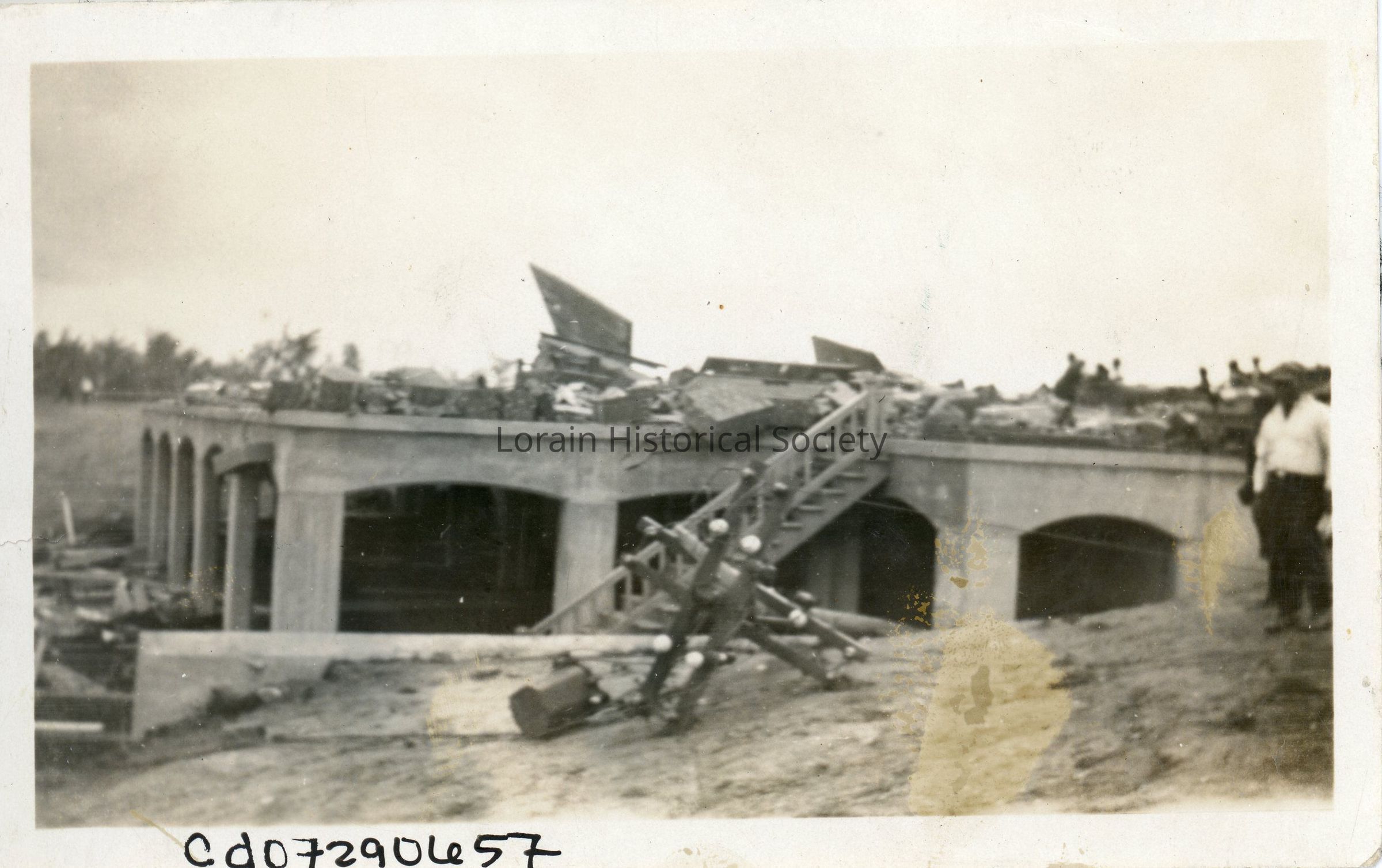 Photograph is view of Bath House at Lakeview Park showing damage and destruction from 1924 Tornado.