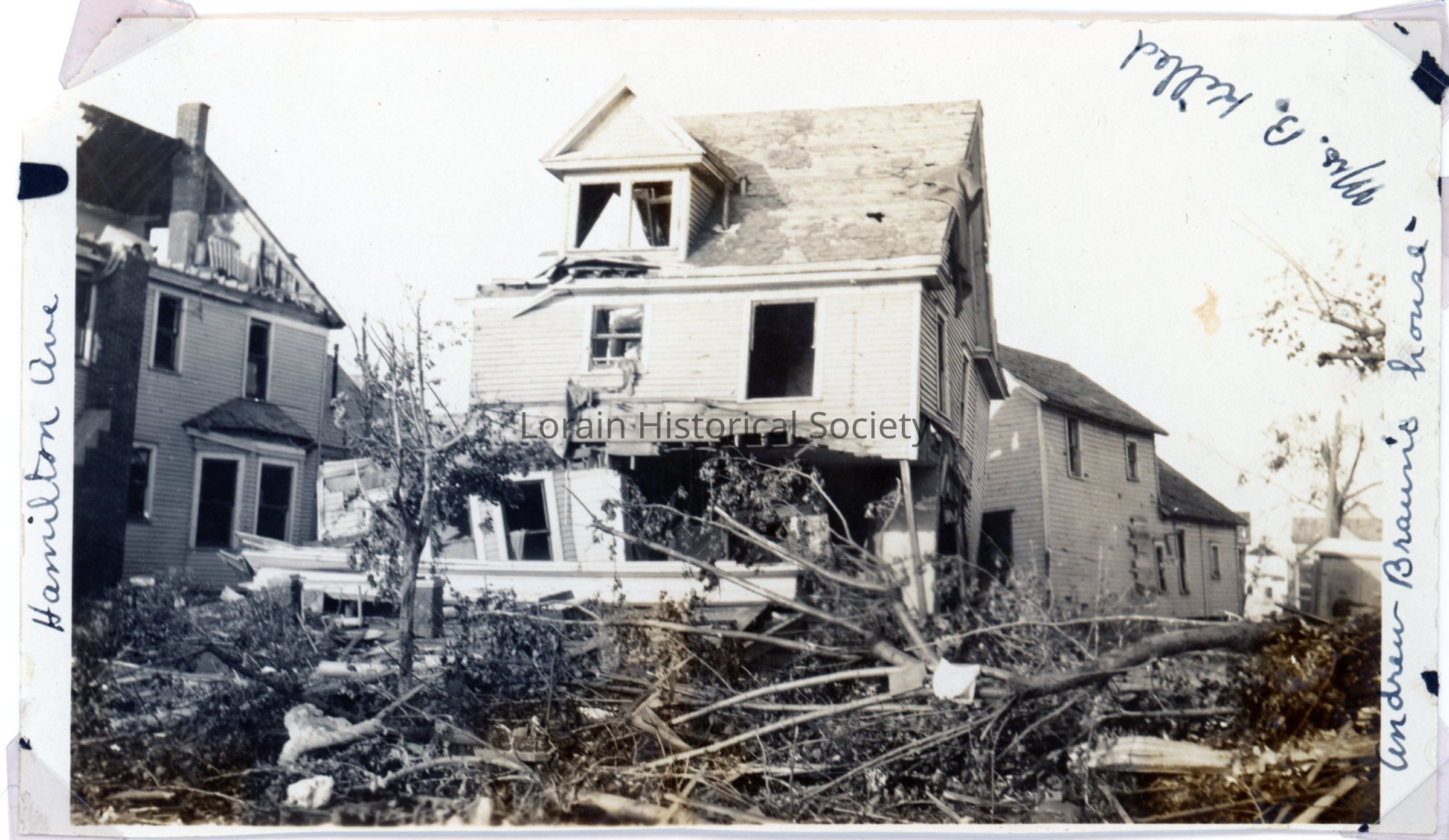 Photograph is view of 527 Hamilton Avenue, Mattie and Andrew Braun Home, showing damage from 1924 Tornado. Mrs. Mattie Braun was killed.Collection