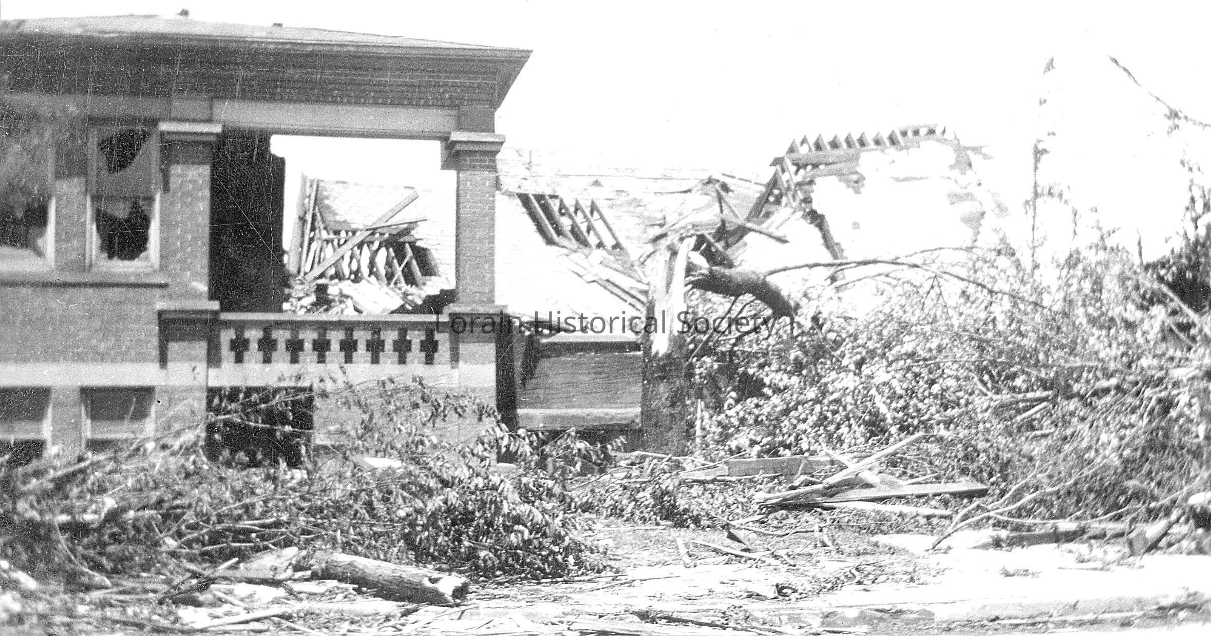 Photograph is black and white view of unidentified house in foreground and Emmanuel Evangelical Church in background, 300 West Sixth Street, showing damage, destruction and debris from 1924 Tornado.
