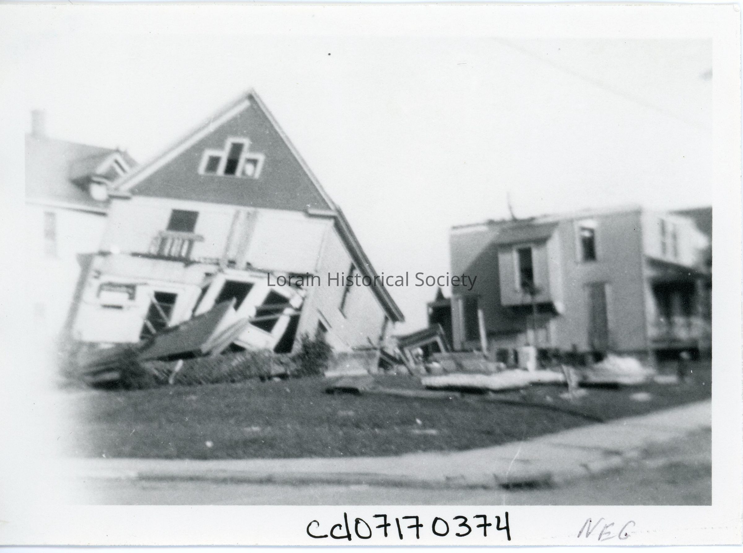Photograph is black and white view of West Erie Avenue and Brownell Avenue showing damage and destruction of homes from 1924 Tornado.