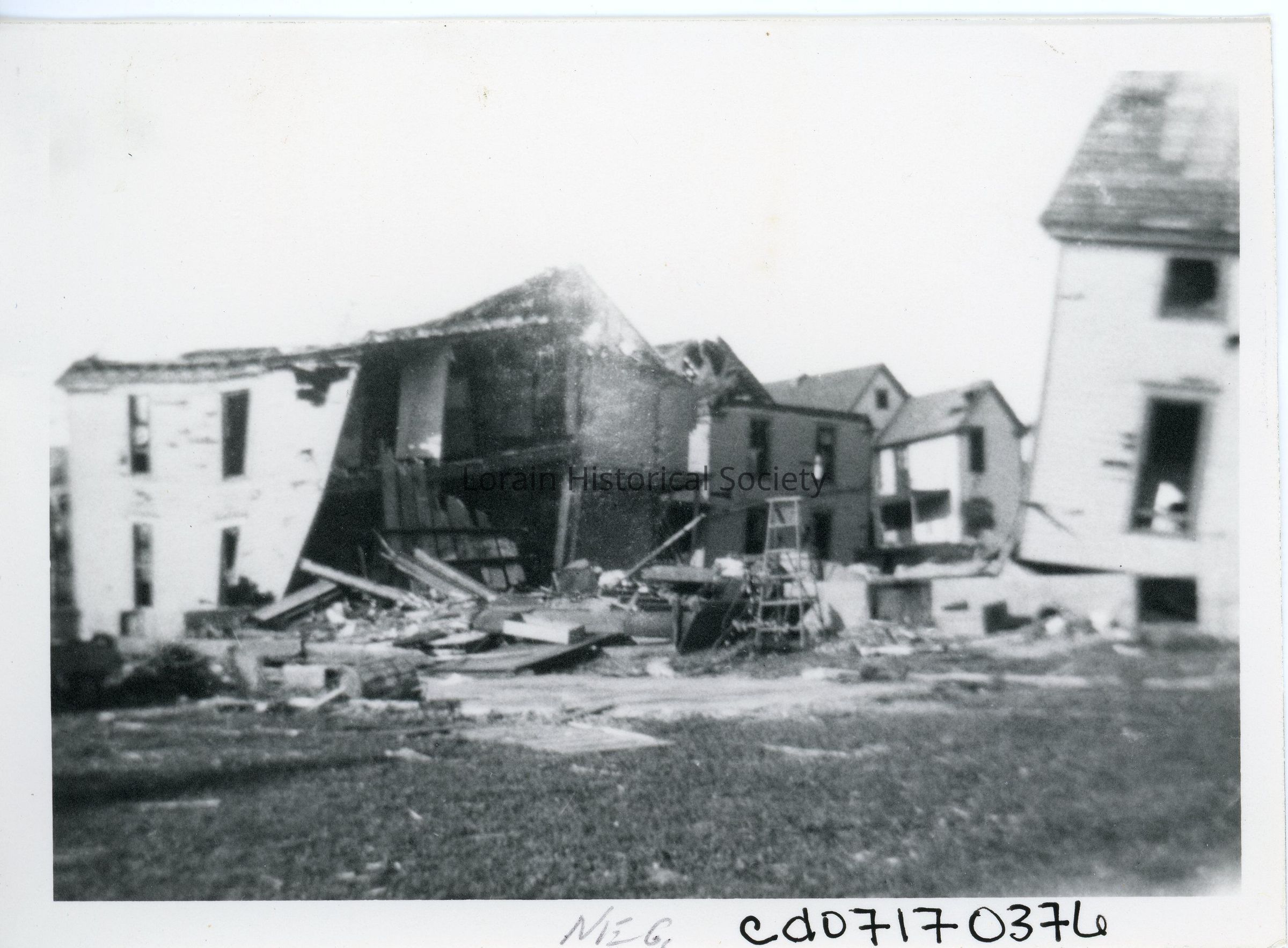 Photograph is black and white view houses that might be on West Second Street between Washington Avenue and Oberlin Avenue showing damage and destruction from 1924 Tornado.Acquisition