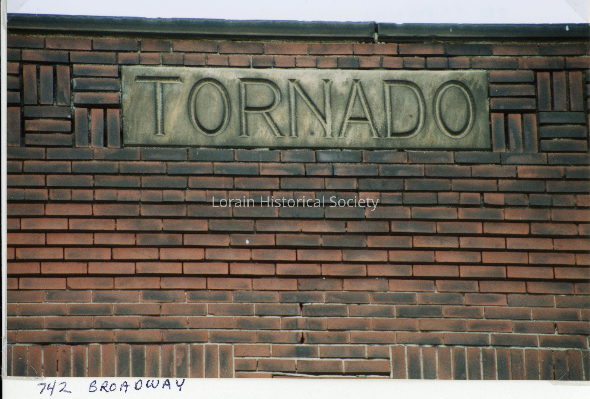 Photograph is color view of the word "Tornado" located at the top of the building at 725 Broadway. Written on the back of the photograph: "'Tornado' word made from bricks after rebuilding".