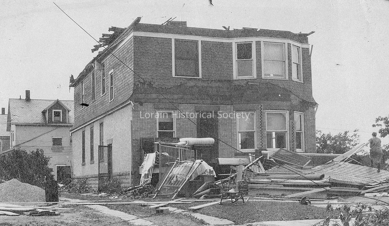 Photograph is black and white view of unidentified houses at the corner of California Avenue and East Erie Avenue, showing damage, destruction and debris from the 1924 Tornado.Photograph Details