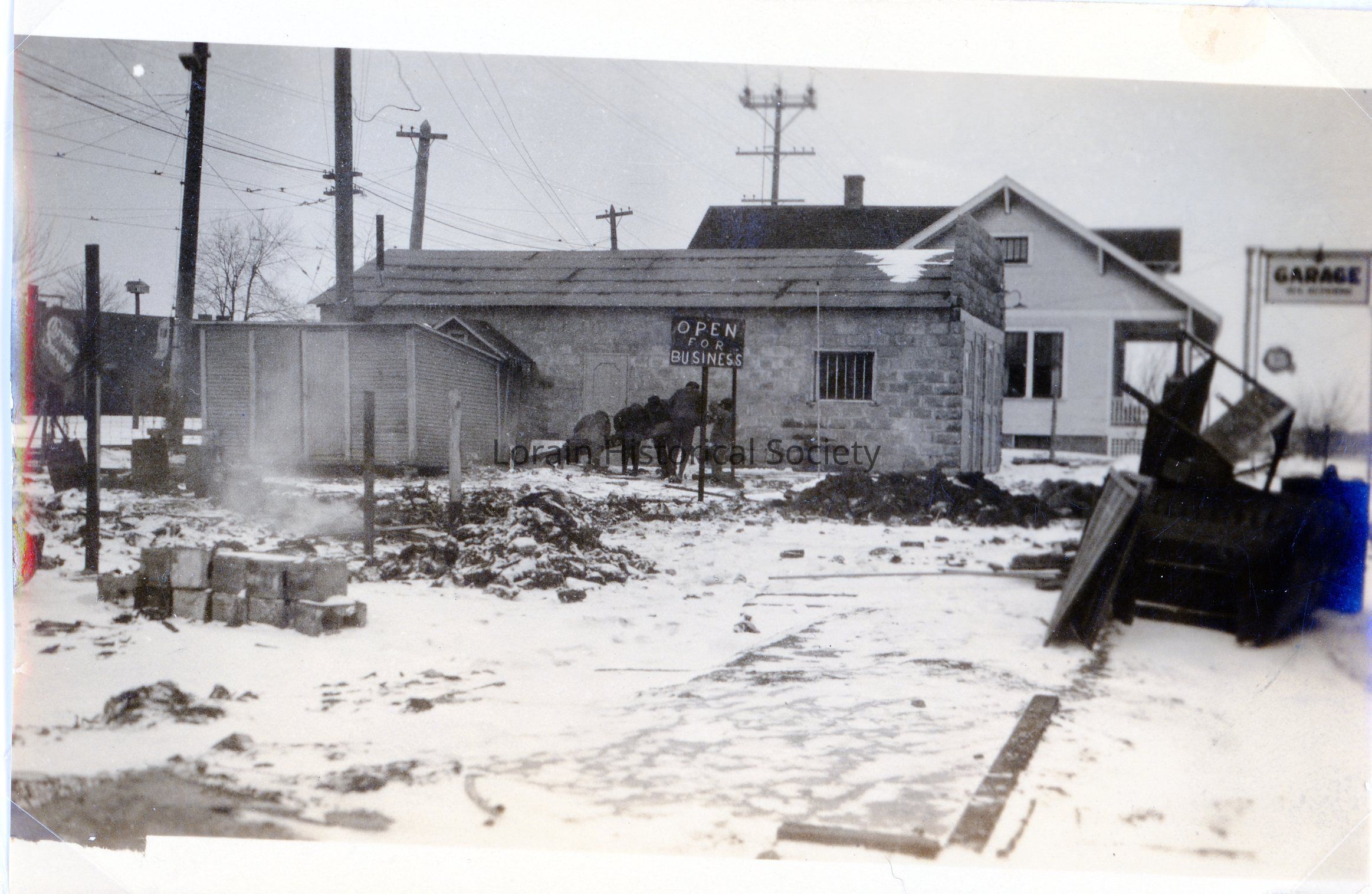 Photograph is black and white view of unidentified building after 1924 Tornado. There is a "Garage" sign on a pole in front of the building and an "Open for Business" sign posted in the side yard. There is a group of identified men lifting a beam in the side yard and a pile of debris near the street.Acquisition