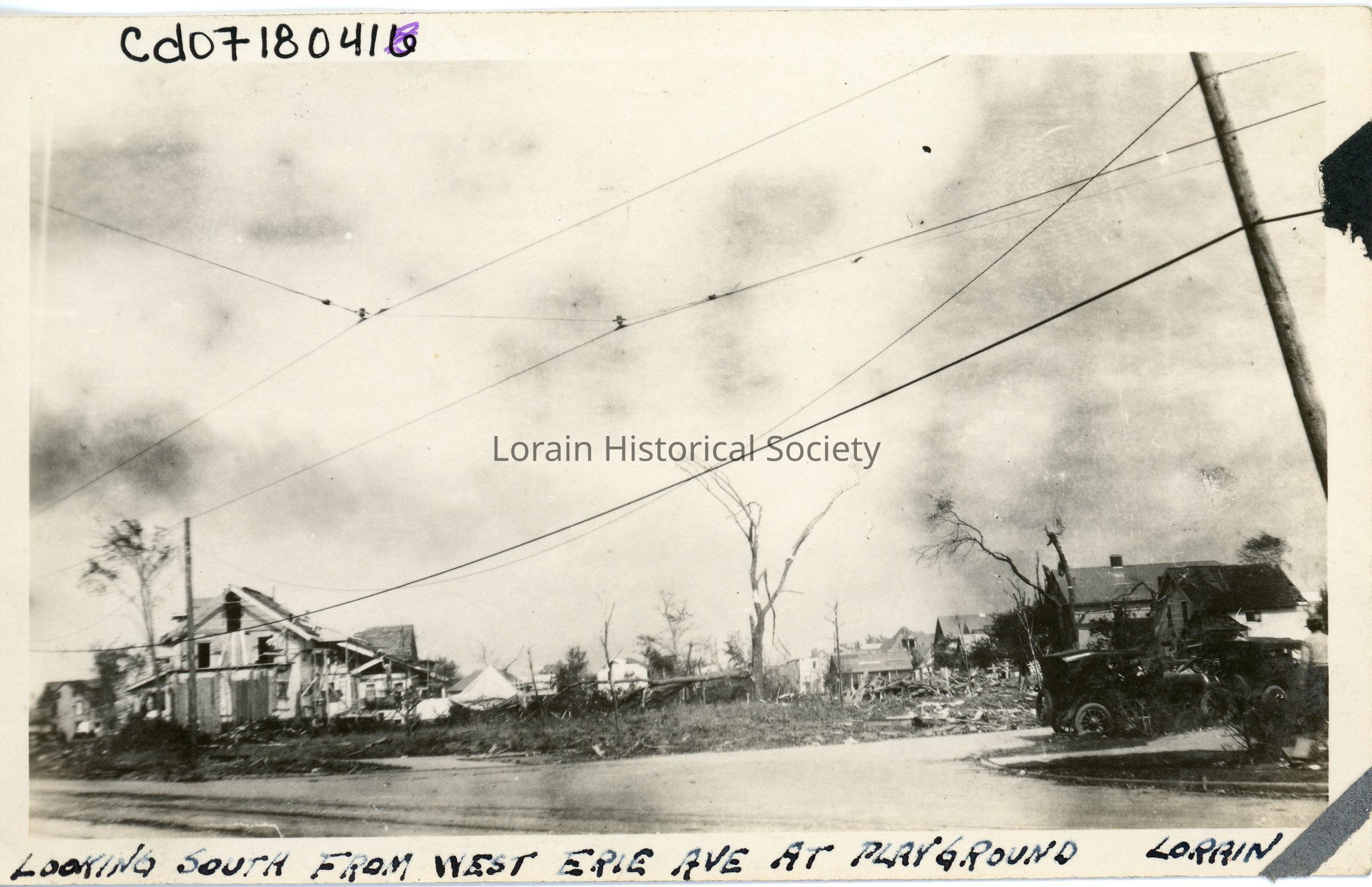 Photograph is black and white view looking south from West Erie Avenue at Lakeview Park, showing damage and destruction from 1924 Tornado. Might be the intersection of Lakeview Park entrance and Mildred Avenue.