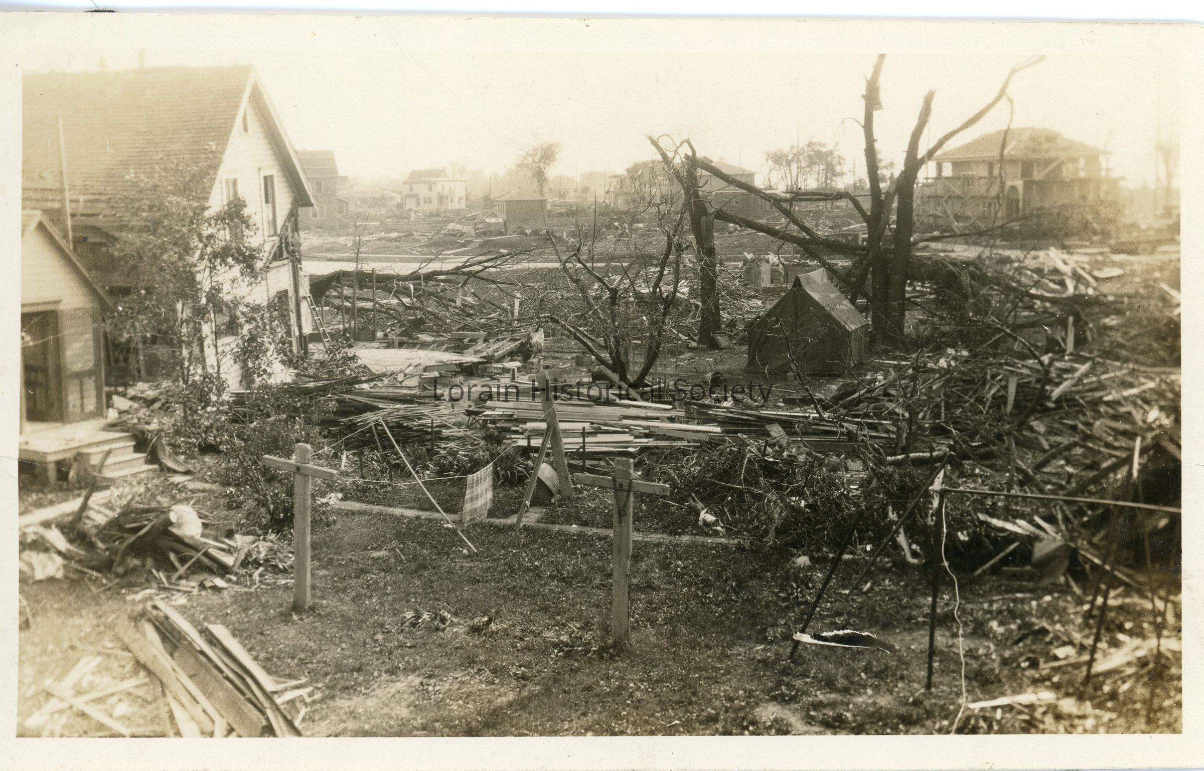 Black and white photograph is view of homes destroyed and damaged on Allison Avenue and West Sixth Street in 1924 Tornado. On left: 1339 West Sixth Street, Nettie (Root) and Waler Goodell Home; Homes destroyed on right: 527 and 535 Allison Avenue; Upper right: 1405 West Erie Avenue, Minnie M. and Allison H. Babcock Home.Acquisition