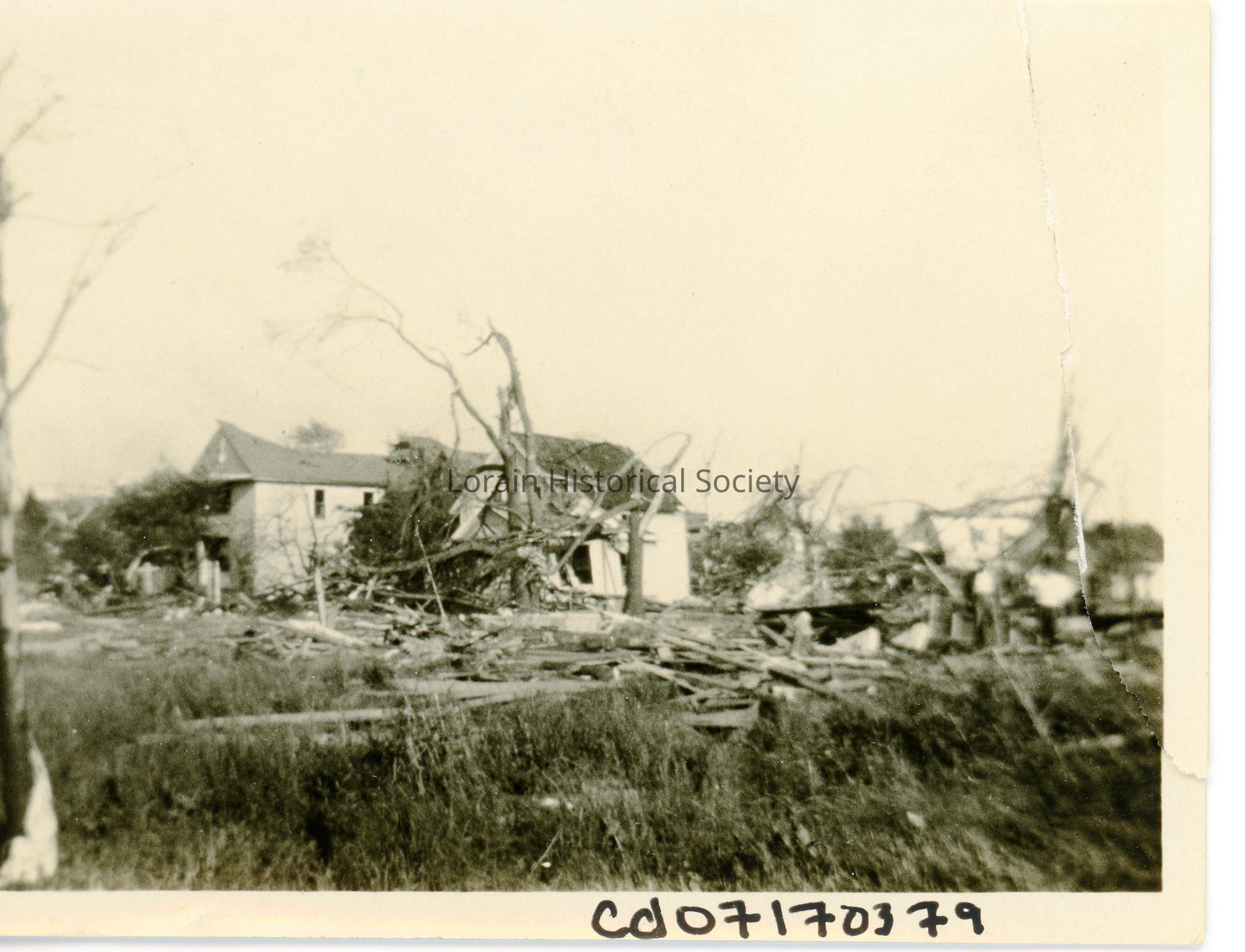 Photograph is black and white view of Unidentified houses showing damage and debris from 1924 Tornado. (Might be East Side Lorain, possibly Florida Avenue).Acquisition
