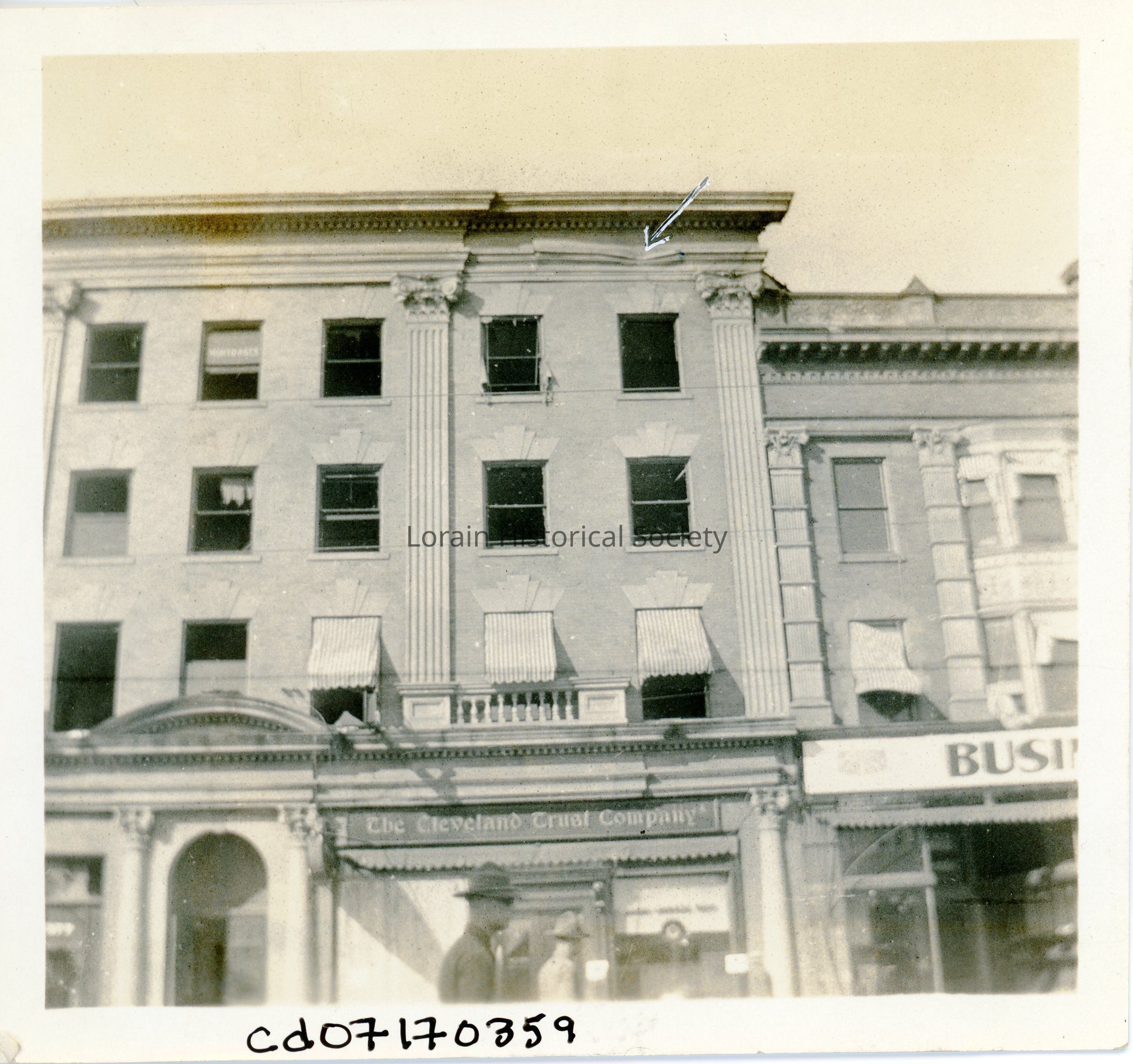 Photograph is black and white view of The Cleveland Trust Company building, 383 Broadway, after 1924 Tornado. The arrow shows a dent in the cornice of the building where a flying Ford hit the building during the tornado.