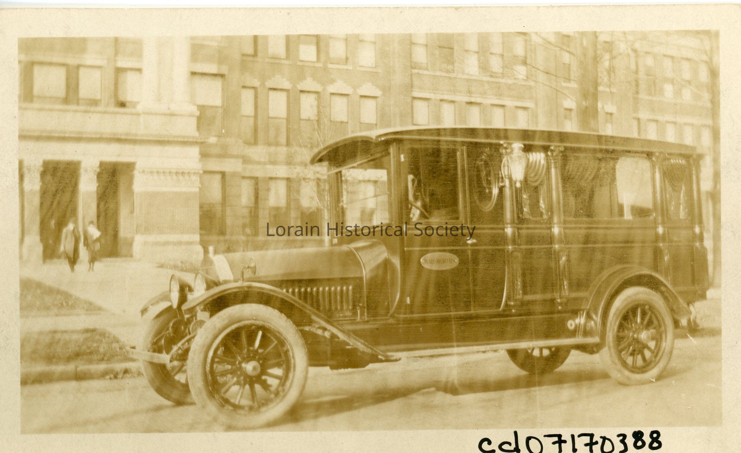 NOTE IN FILE: Seventy eight people were killed in the tornado that day. Most deaths came from the State Theatre, and the next highest was from the Bath House. The Lorain High School was used as a hospital and morgue. Pictured above is a hearse in use that day.