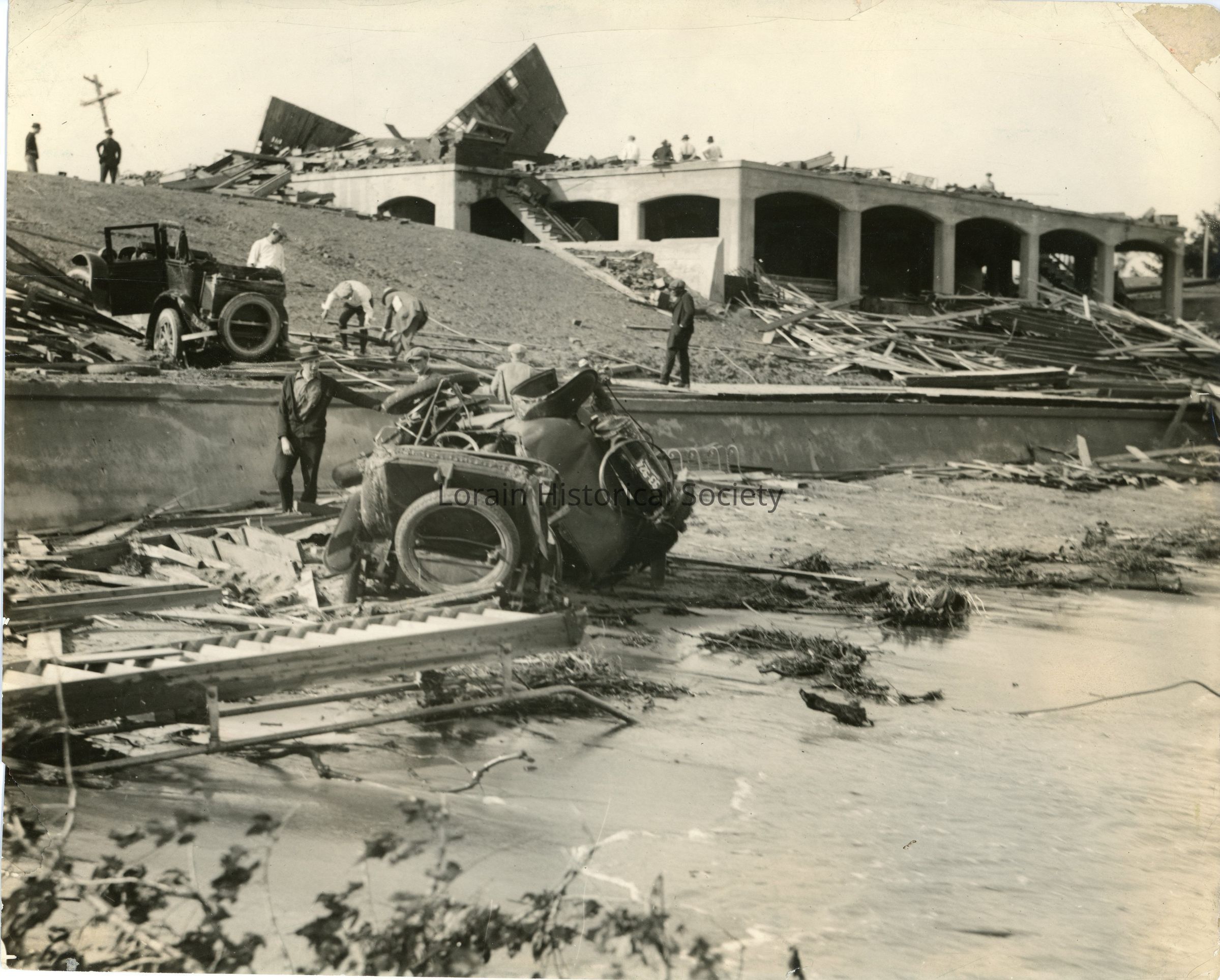 Photograph is black and white view of Lakeview Bath House showing destruction and damage to building and automobiles during 1924 Tornado.Acquisition