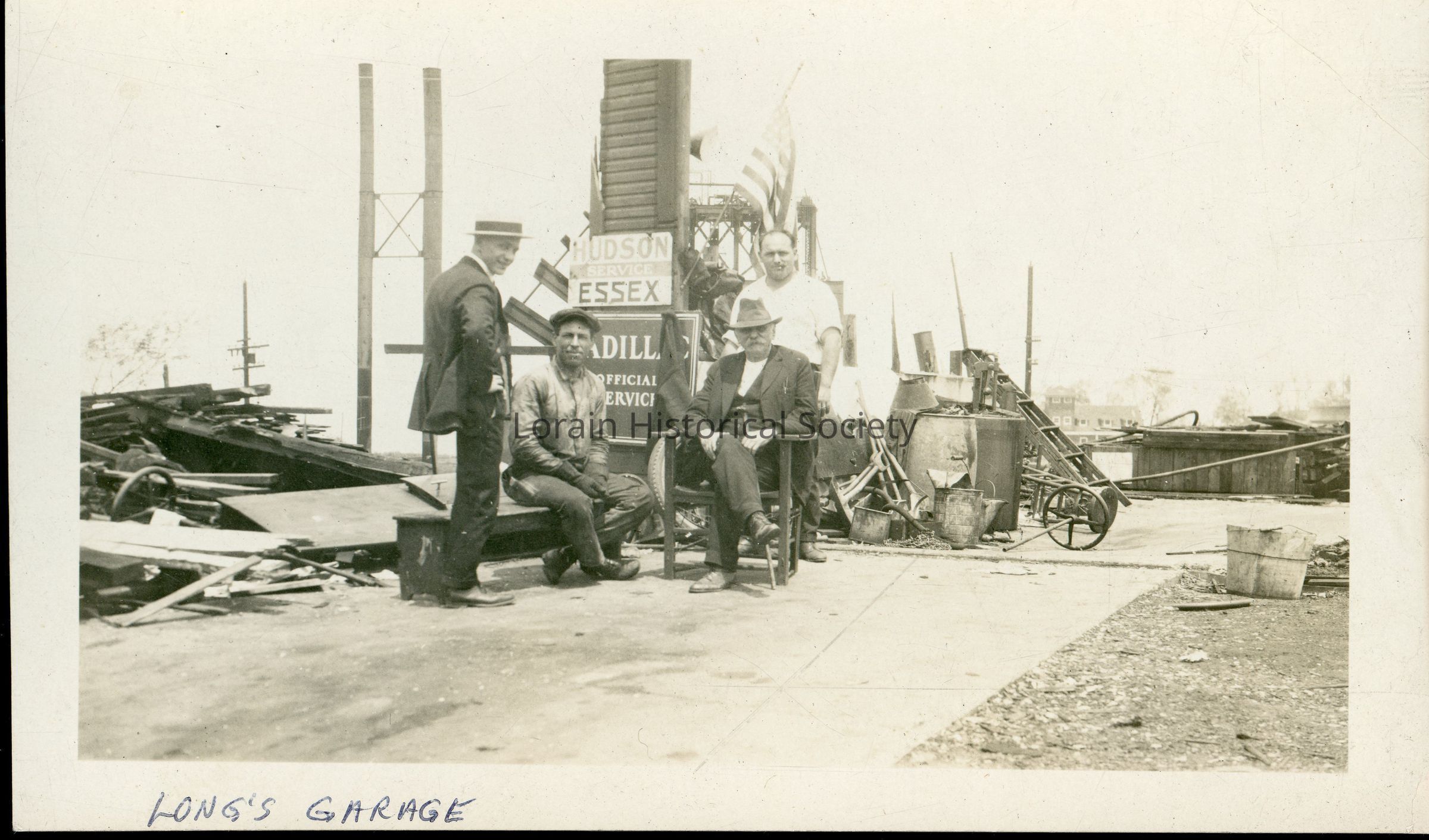 Photograph is black and white view of Long's Garage, 241-245 Broadway, with group of men in front showing destruction from 1924 Tornado. American flag, sign for Hudson Essex and Cadillac Service in the background.Acquisition