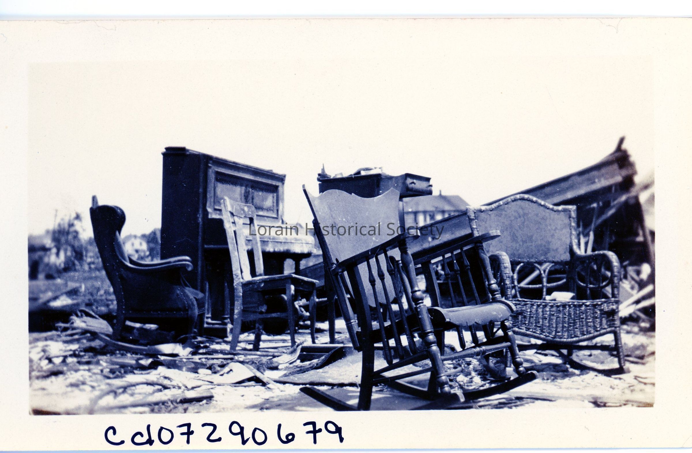 Photograph is black and white view of debris and furniture sitting outside after 1924 Tornado.