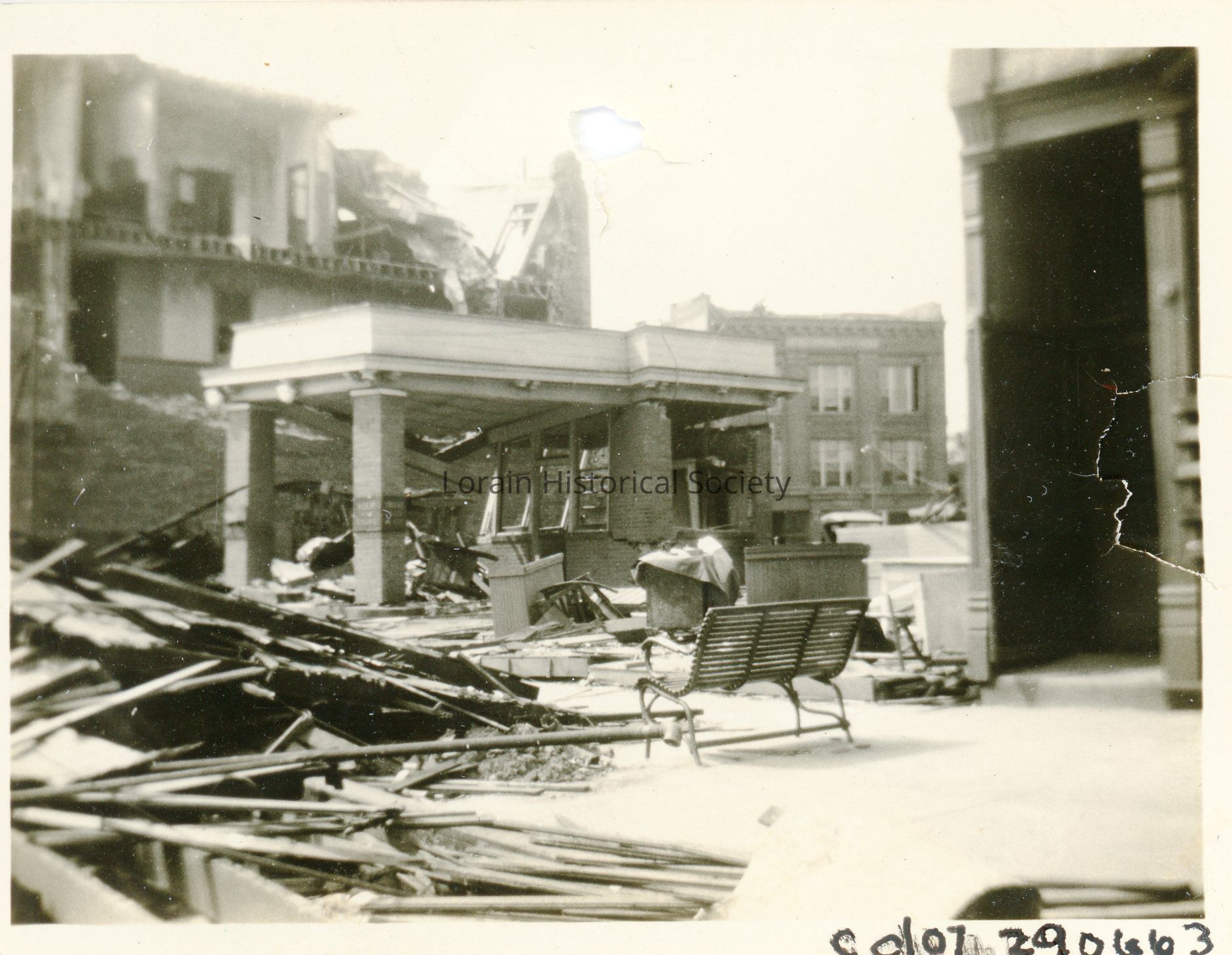 Photograph is black and white view of Canfield Service Station, corner of North Broadway and West Erie Avenue, and other businesses showing damage from 1924 Tornado. L to R: 280-282 North Broadway, Hotel Black, Mrs. Carrie Warden, Proprietress; 276 North Broadway, Canfield Service Station, Henry Kaufman and Perry Meachan, Attendants; 272 North Broadway, William Gage Restaurant with debris in front; Lorain Police Station and Jail in background.Acquisition