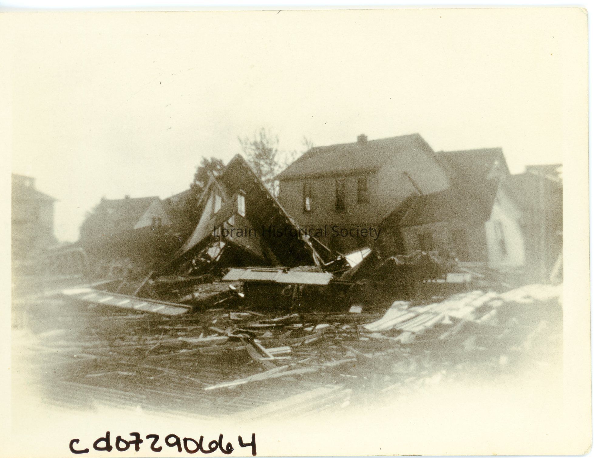 Photograph is black and white view of unidentified houses showing damage and destruction from 1924 Tornado.Acquisition
