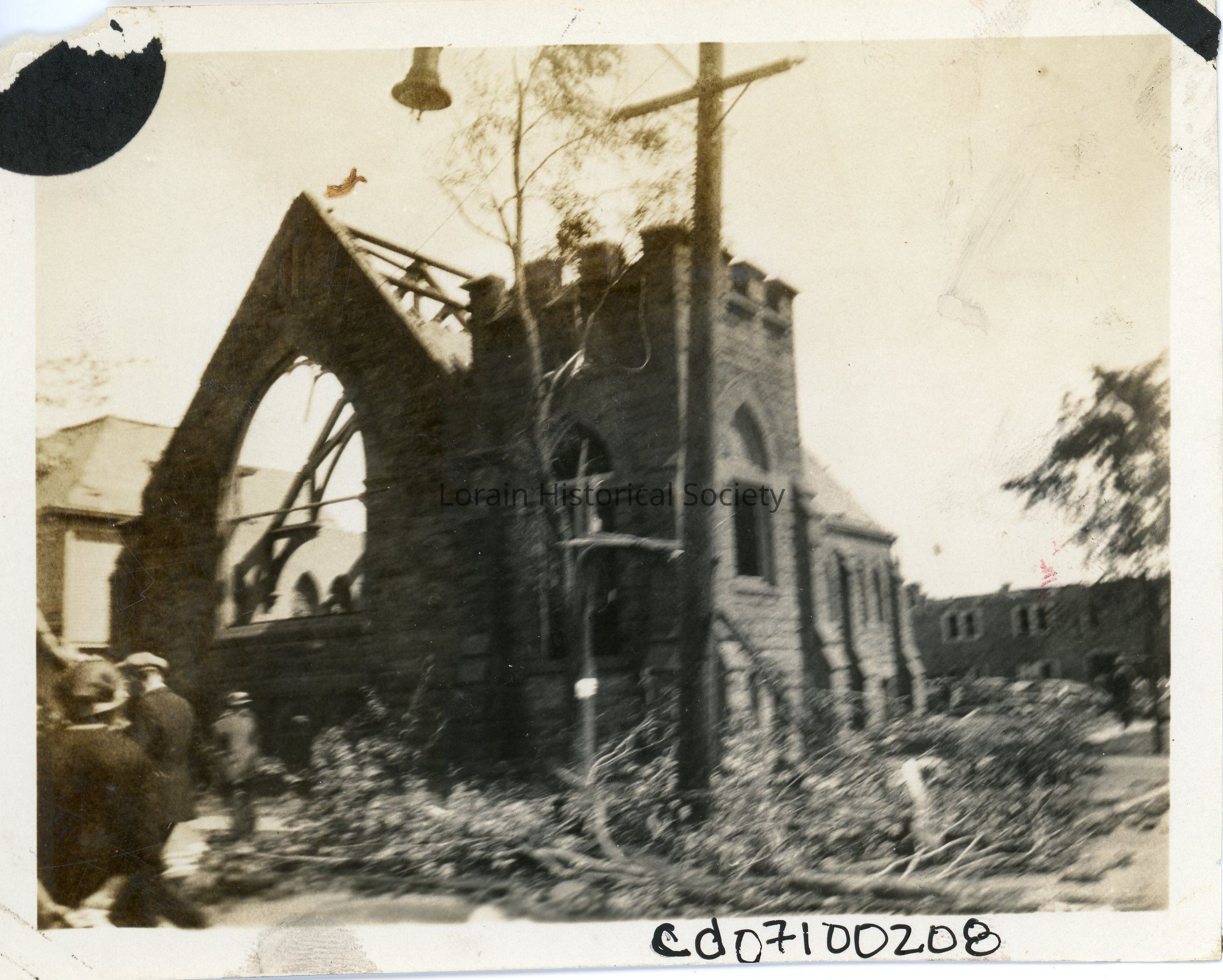 Photograph is black and white view of Church of the Redeemer, 657 Reid Avenue, showing destruction from 1924 Tornado.Photograph Details