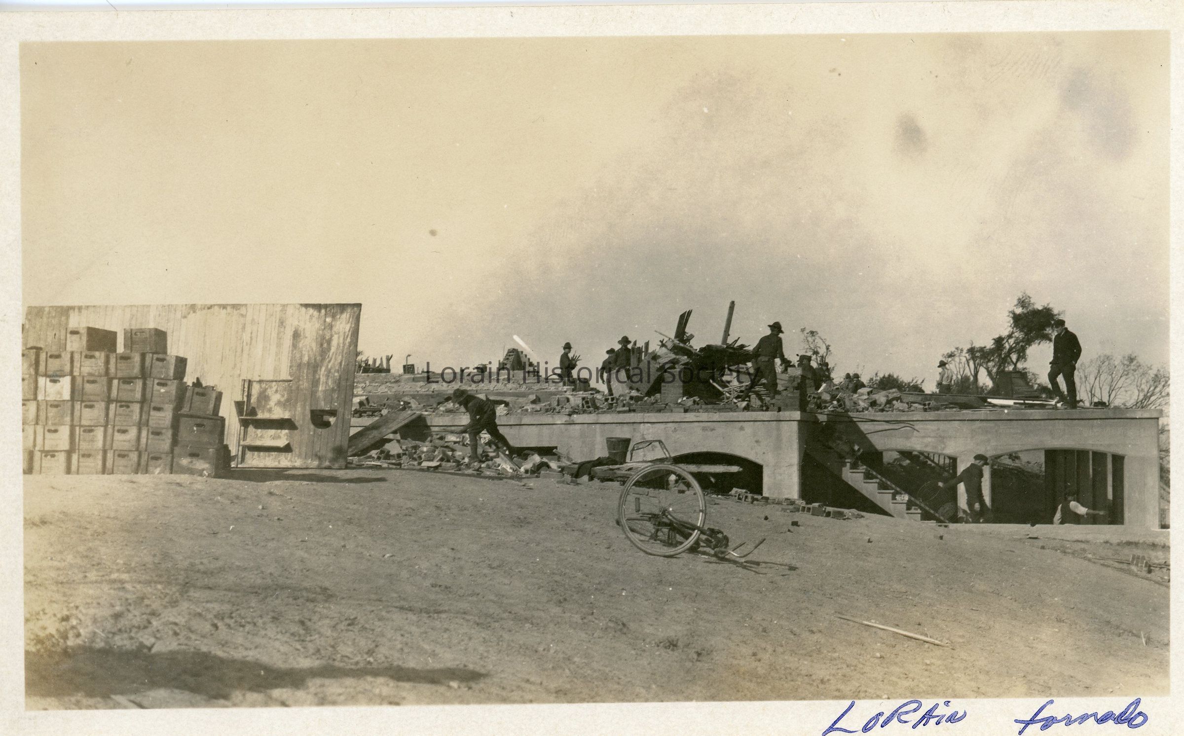 Photograph is black and white view of Lakeview Bath House showing debris and destruction from 1924 Tornado. National Guardsmen and workers are going through debris.
