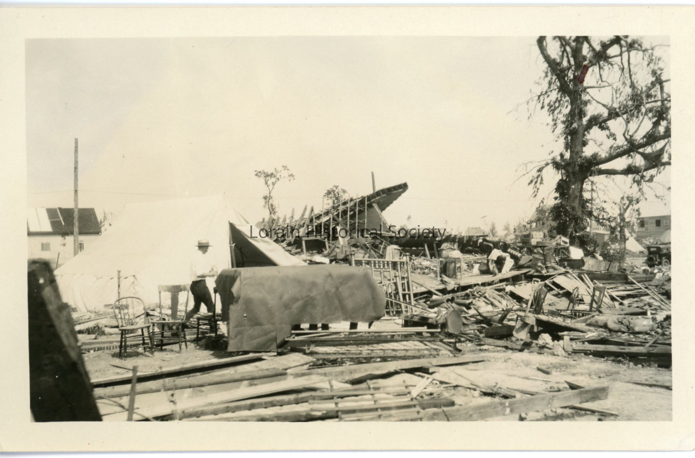 Photograph is black and white view of unidentified houses showing damage, destruction and debris from 1924 Tornado. Unidentified man wearing straw hat in foreground.Acquisition