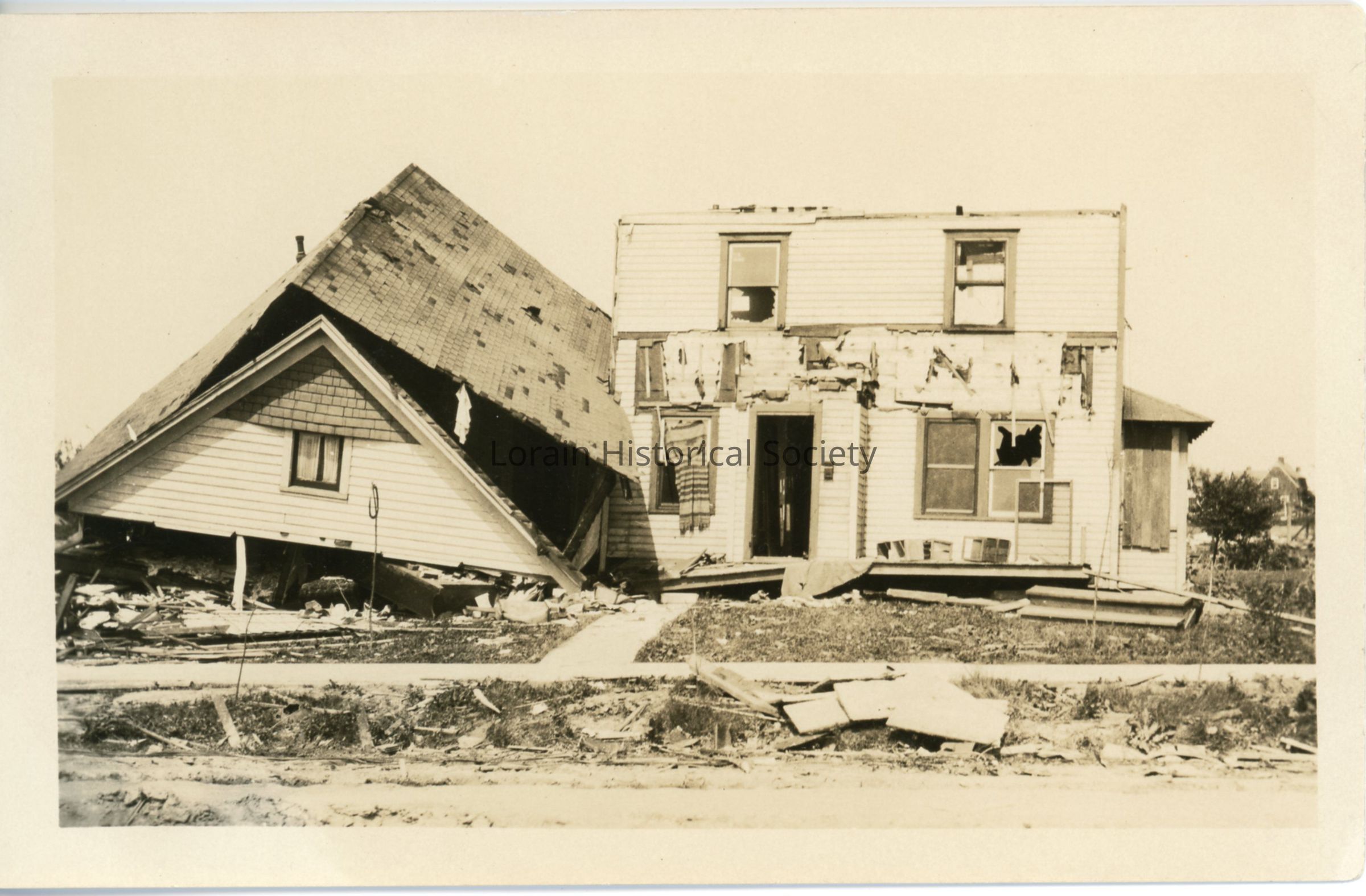 Photograph is black and white view of unidentified houses showing destruction and debris from 1924 Tornado.Acquisition