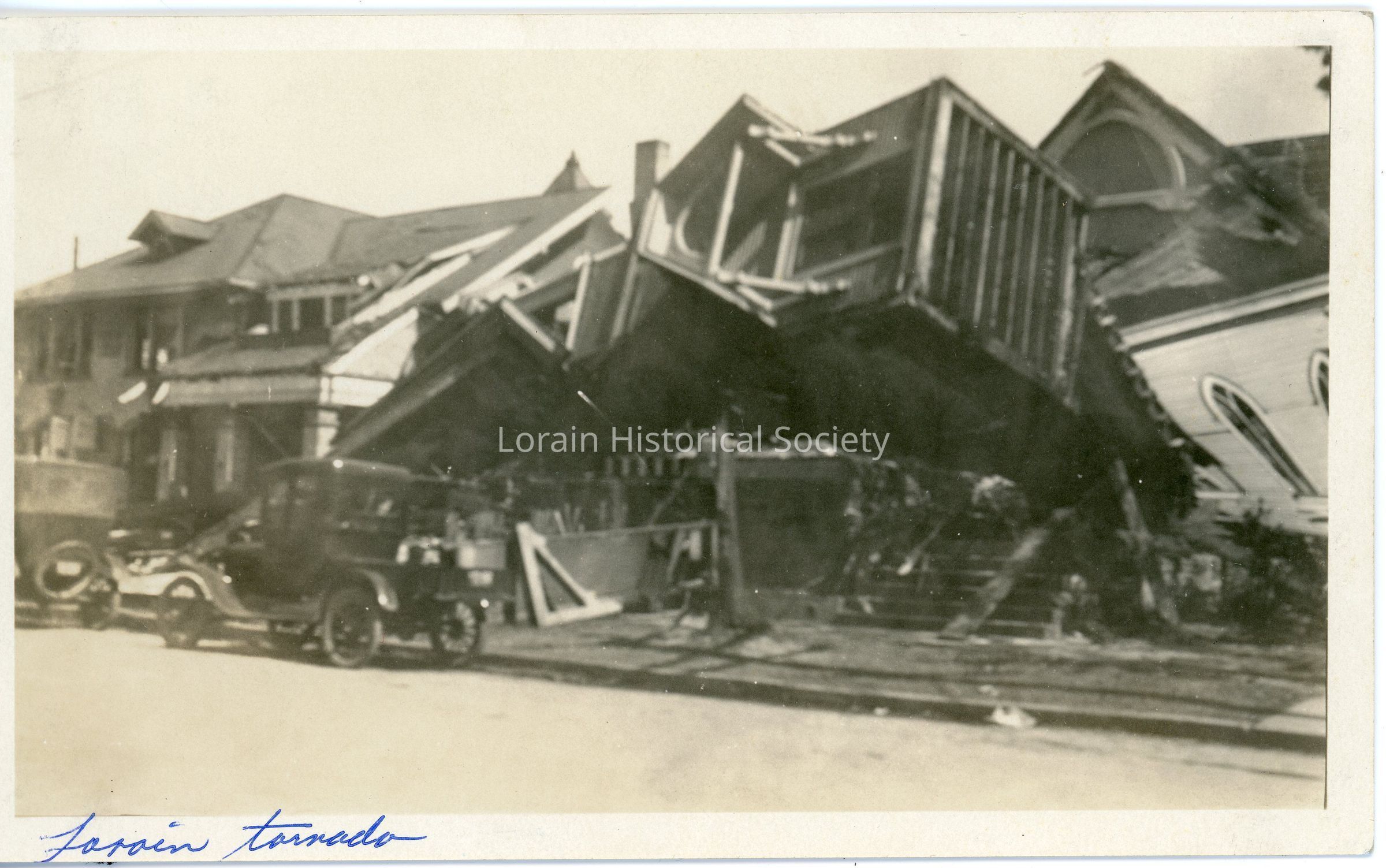 Photograph is black and white view of First Congregational Church, corner of West Fourth Street and Washington Avenue, with steeple that fell on No. 1 Fire Station next door, showing destruction from 1924 Tornado.